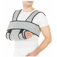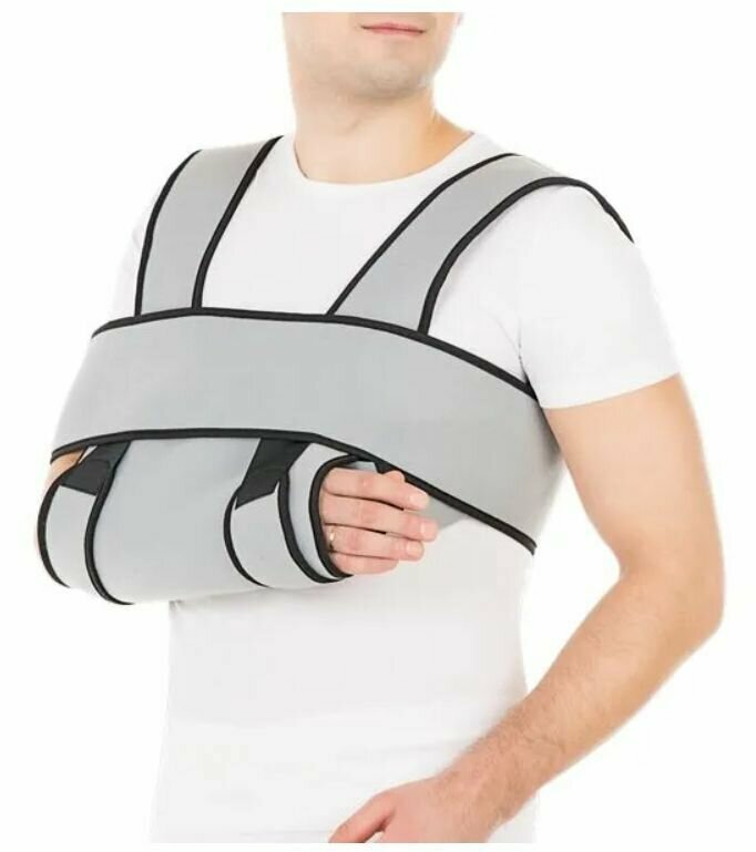 повязка Дезо состоит из муфты для оптимального размещения верхней конечности в функционально выгодном положении и съемного пояса для надежной фиксации верхней конечности к туловищу -