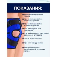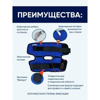 Бандаж разгружает коленный сустав, фиксирует капсульно-связочный аппарат. Конструкция исключает переразгибание и боковые отклонения. Коленная чашечка стабилизируется за счёт специального отверстия. Материал обладает согревающим и массажным свойствами.