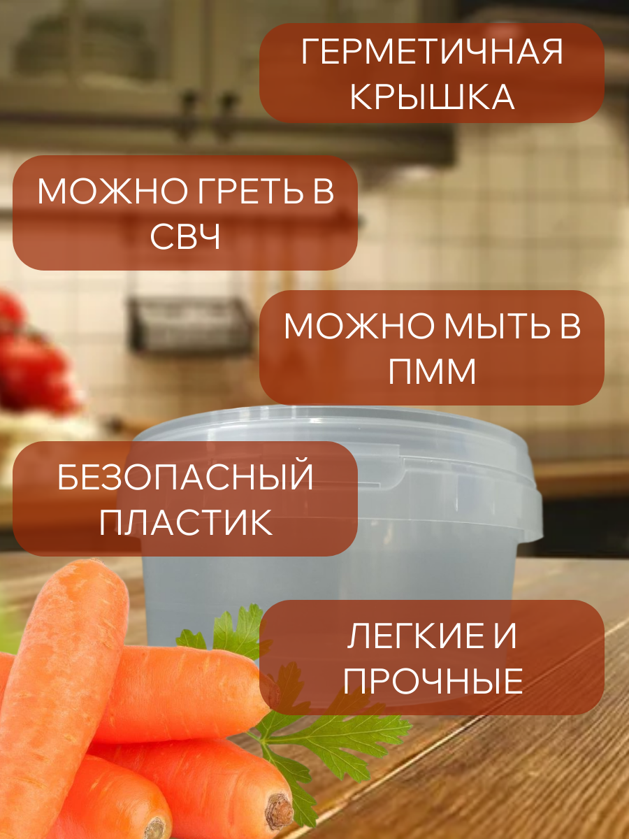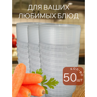В наборе 50 штук, термостойкая. Бесцветная банка из полипропилена с прозрачной крышкой. Пластик PP. Диаметр: 13 см, высота 6,5 см.