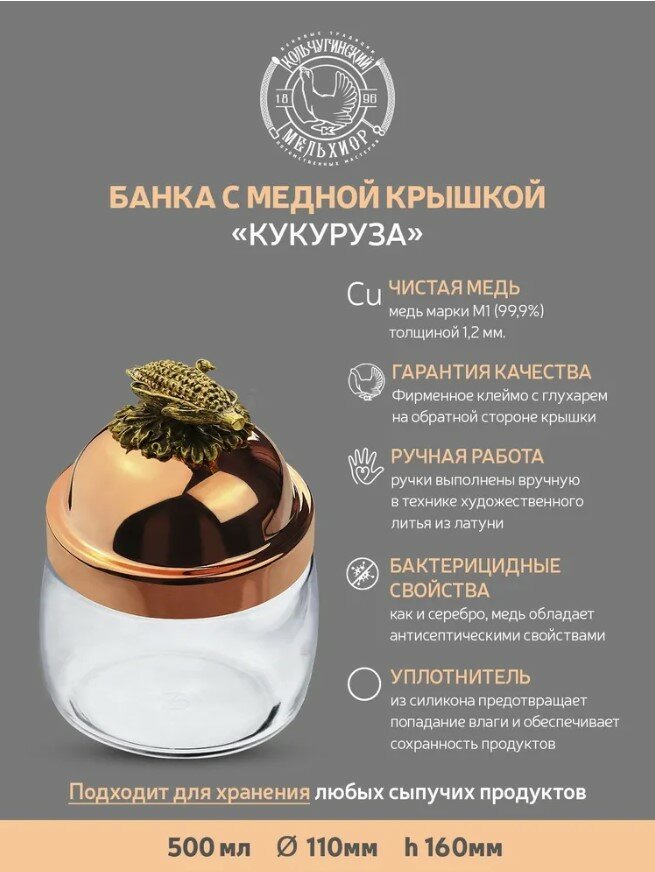Банка для сыпучих продуктов Кольчугинский мельхиор Кукуруза с медной крышкой 500мл.: сравнение цен, характеристики, фото, актуальное наличие и цены.