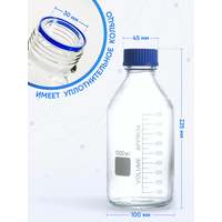 Предназначена для хранения химических реактивов. Изготовлена из химико-лабораторного стекла, крышка изготовлена из полипропилена. Крышка укомплектована силиконовой уплотнительной прокладкой