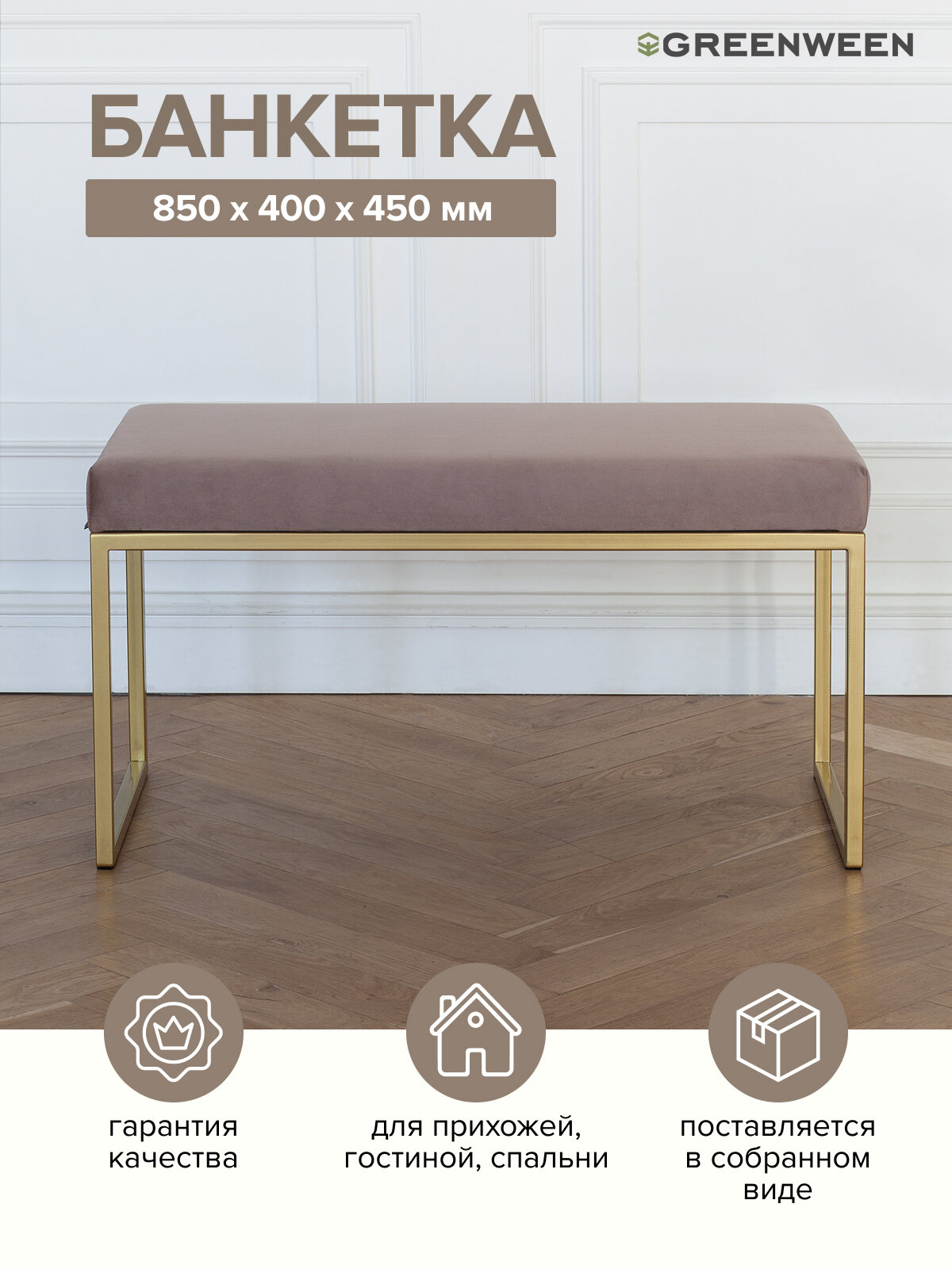 Бархатистая ткань легко чистится от загрязнений, для ухода разрешена сухая и влажная чистка. Стильная банкетка подойдет для прихожей, спальни, гостиной и кабинета.