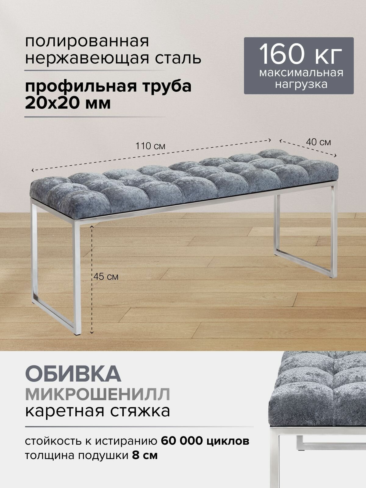 Банкетка ALBA, н/ж сталь, Steel Grey, каретная стяжка, 1100х400х450: сравнение цен, характеристики, фото, актуальное наличие и цены.