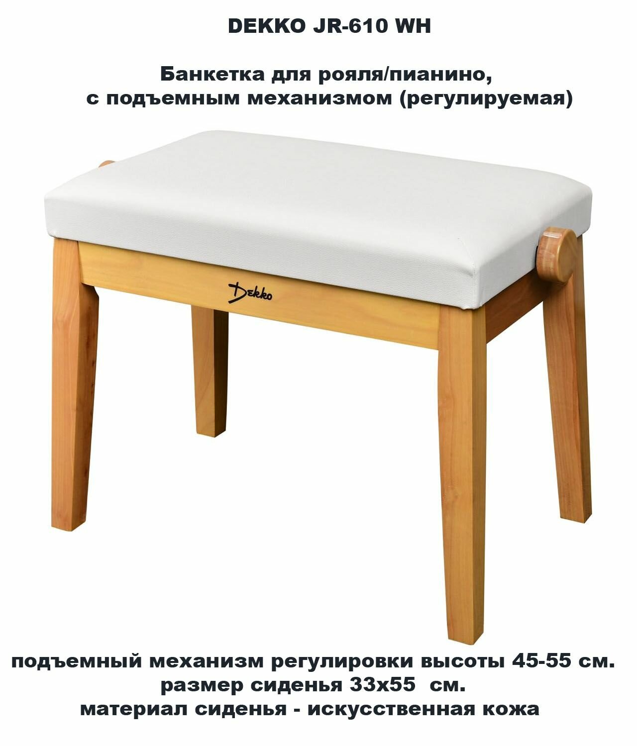 Деревянная банкетка для игры на пианино или рояля DEKKO JR-610 с возможностью регулировки сидения по высоте позволит комфортно играть на инструменте и взрослому и ребенку. Плавная регулировка от 45 до 55 см.