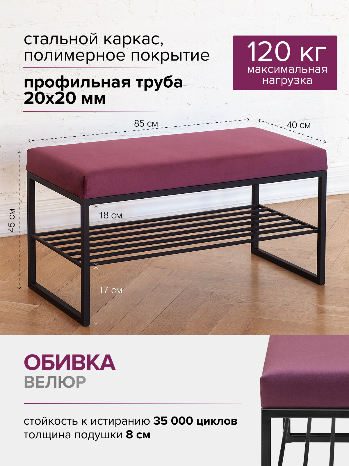 Банкетка с велюровой подушкой отличается элегантным видом и комфортной посадкой. Мягкая обивка с высокой износостойкостью, прошла тест Мартиндейла — 35 000 циклов.