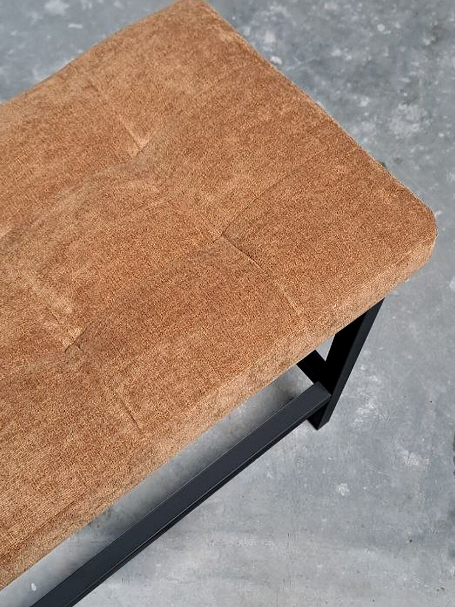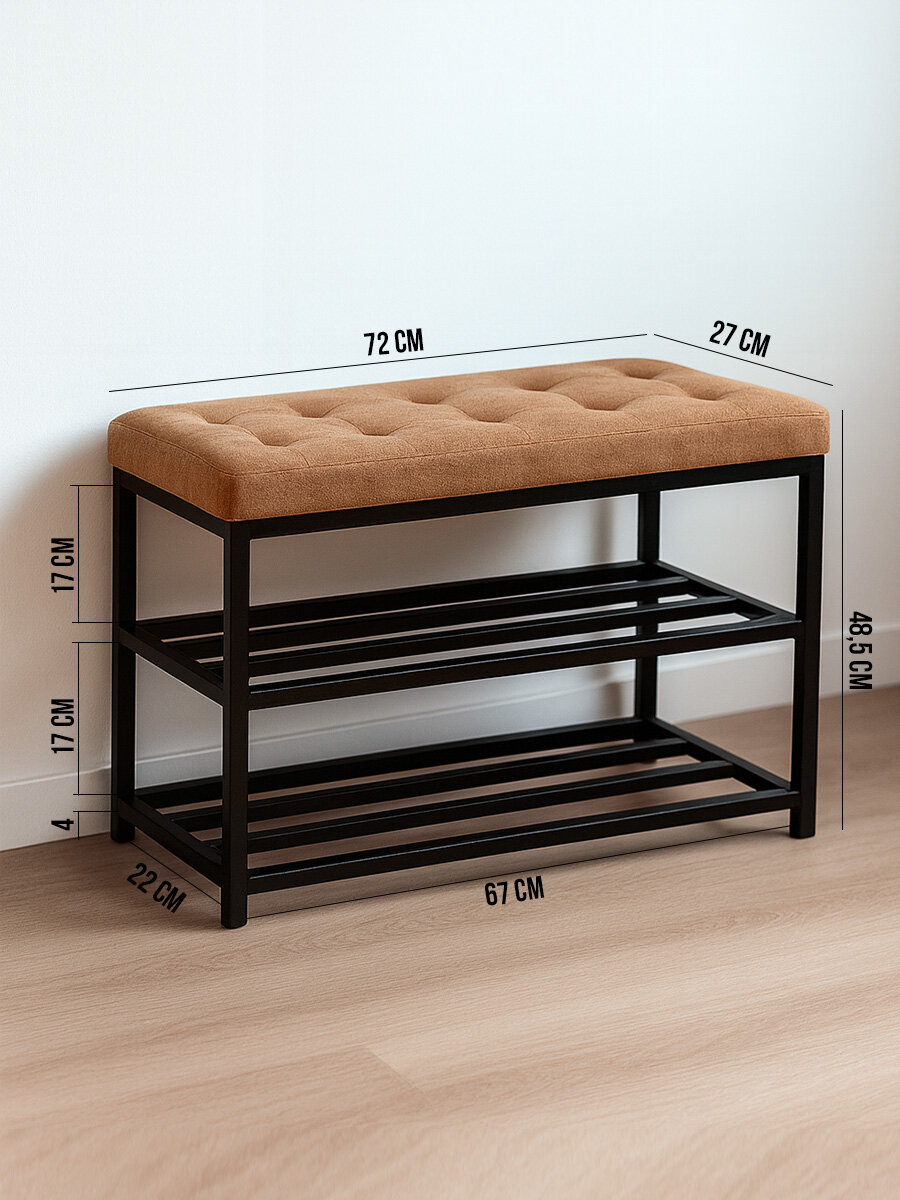 Железные ножки маленькой бюджетной скамьи защищены заглушками для предотвращения царапин на полу. Этажерка с полочкой доставляется в коробке, дополнительная сборка и инструменты не требуются.
