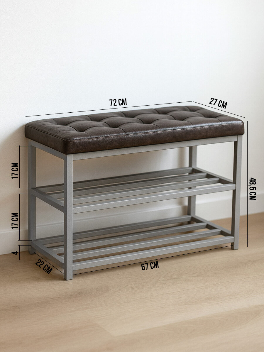 Компактная узкая пуф банкетка шириной 72 см и глубиной 27 см с полкой для обуви в два яруса не занимает много места и впишется не только в маленьком коридоре, но и прекрасно будет смотреться в интерьере гостиной, ванной комнате, детском саду, на кухне и балконе. Современный стиль лофт придает особый шарм в спальне у прикроватной зоны у кровати и туалетного столика, а универсальная расцветка позволит установить галошницу в кабинете офиса вместо офисных скамеек в зале ожидания, заменит простой и обычный обувной стеллаж в кладовой и гардеробной системе, стойку или подставку в примерочной или ПВЗ. На летнее время можно поставить вместо лавочки для отдыха на веранду или террасу на даче.