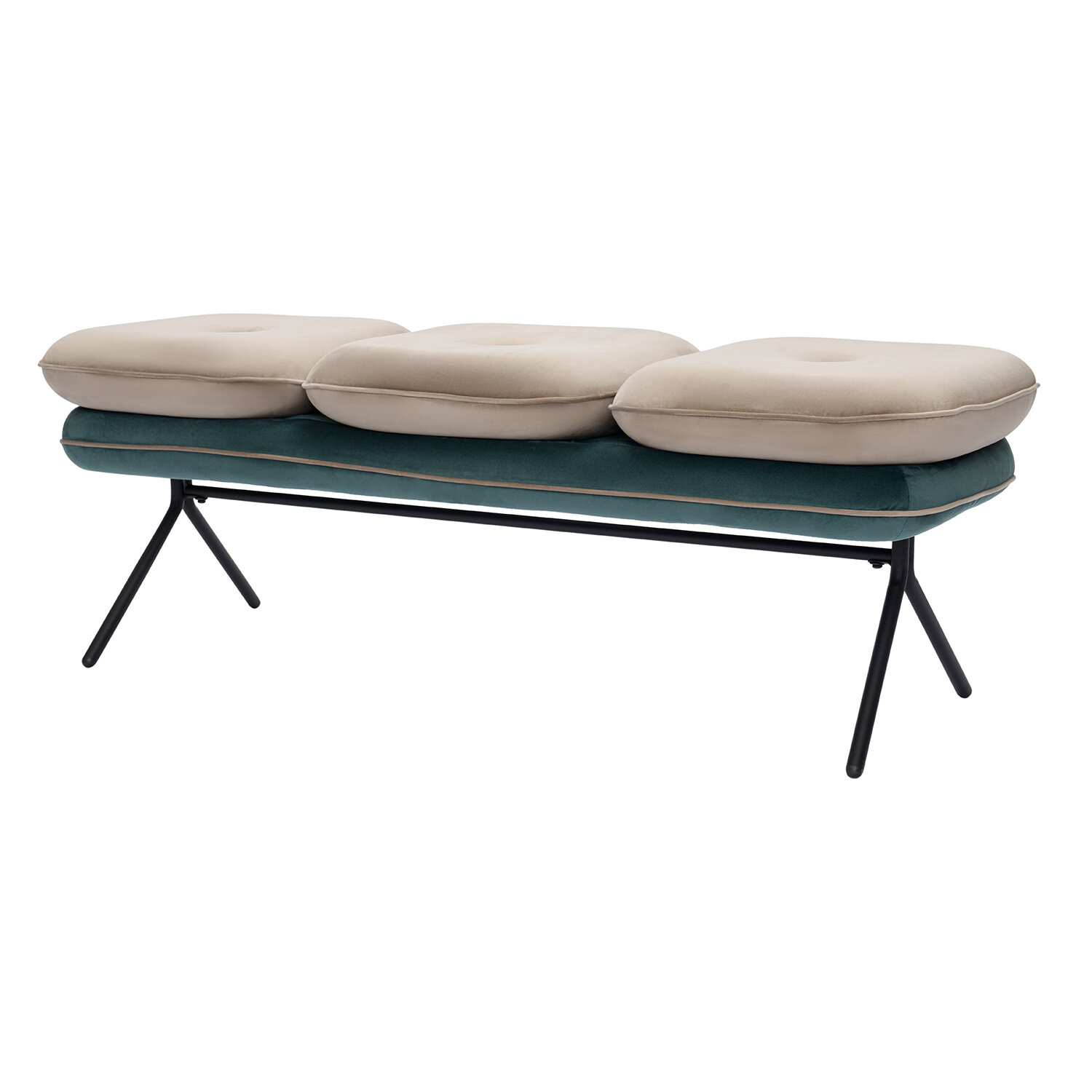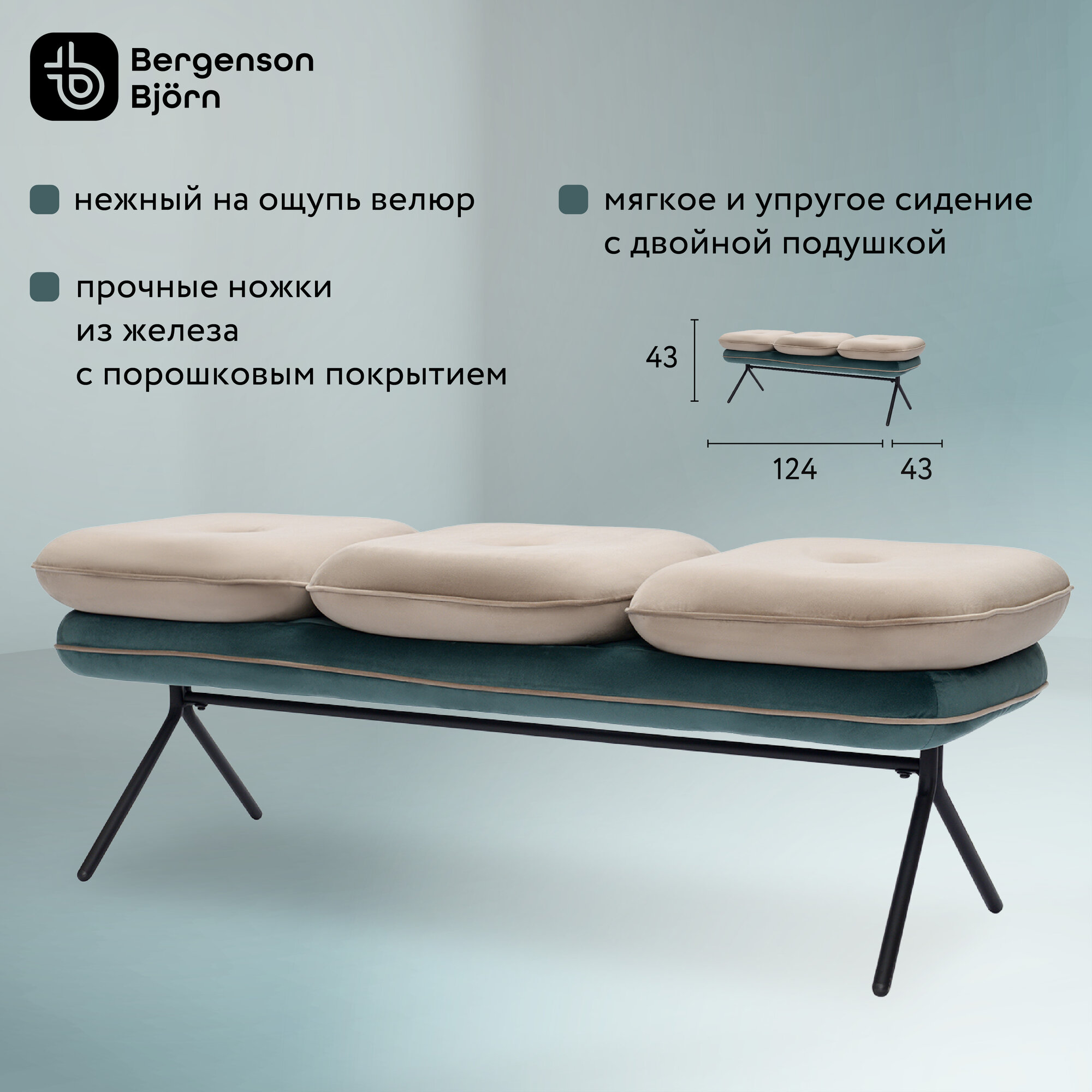 - Обивка из велюра создает приятные тактильные ощущения, смотрится презентабельно, придавая мебели изысканный вид. - Удобные раздельные сиденья с наполнителем из пенополиуретана обеспечивают комфортную посадку. - Ножки из железа имеют порошковое покрытие, которое защищает их поверхность от коррозии, потускнения цвета и механических повреждений. - Стабильная и прочная конструкция делает банкетку устойчивой, надежной и долговечной. - Дизайн актуален для классических и современных стилевых направлений.