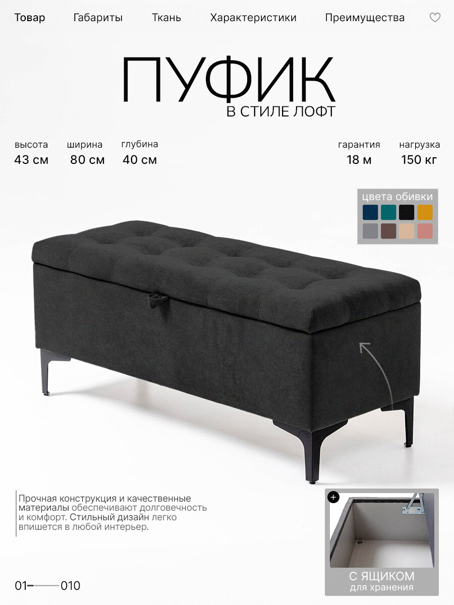 Банкетка-пуфик в прихожую с ящиком для хранения «Лонг», велюр черный ,80x40x43. На кухню, балкон, офис и салон красоты.: сравнение цен, характеристики, фото, актуальное наличие и цены.