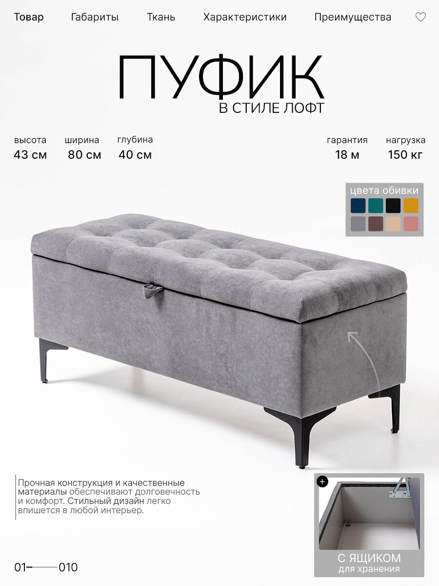Банкетка-пуфик в прихожую с ящиком для хранения «Лонг», велюр серый, 80x40x43. На кухню, балкон, офис и салон красоты.: сравнение цен, характеристики, фото, актуальное наличие и цены.