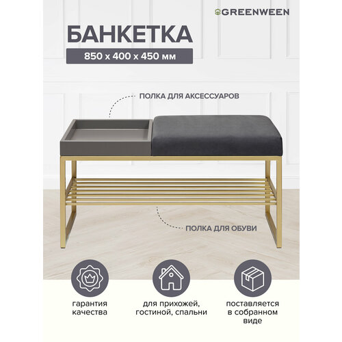 Для хранения предусмотрена металлическая полочка на 5 пар обуви. На ножках банкетки есть войлочные накладки для защиты напольного покрытия. На пуфике удобно разместится 1 человек, максимальная нагрузка на банкетку 120 кг.