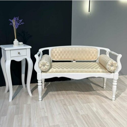 Банкетка Шарм выполнена в классическом стиле! Дерево в цвете слоновая кость и жаккард в цвете золото идеально сочетаются между собой! На ткань дополнительно нанесен узор серебряными нитями, а спинка и подушки украшены тесьмой