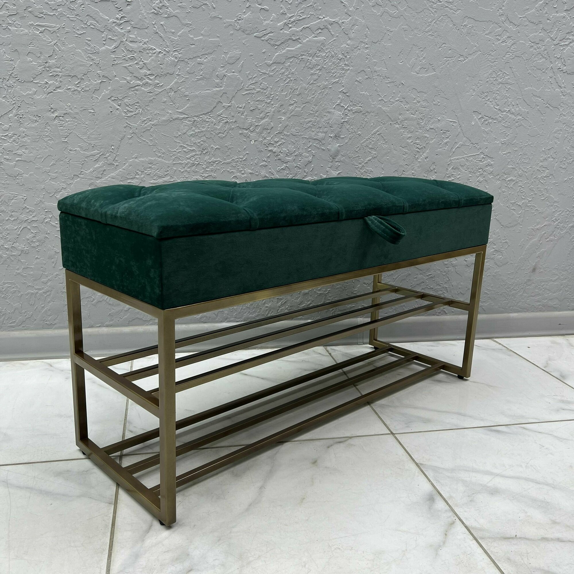 Нижние полки позволяют держать повседневную обувь под рукой, сохраняя порядок в прихожей. Сиденье обито мягким велюром: оно приятно на ощупь, хорошо переносит ежедневное использование и легко очищается. Прочный металлический каркас обеспечивает устойчивость, а универсальный дизайн подходит для большинства интерьеров.