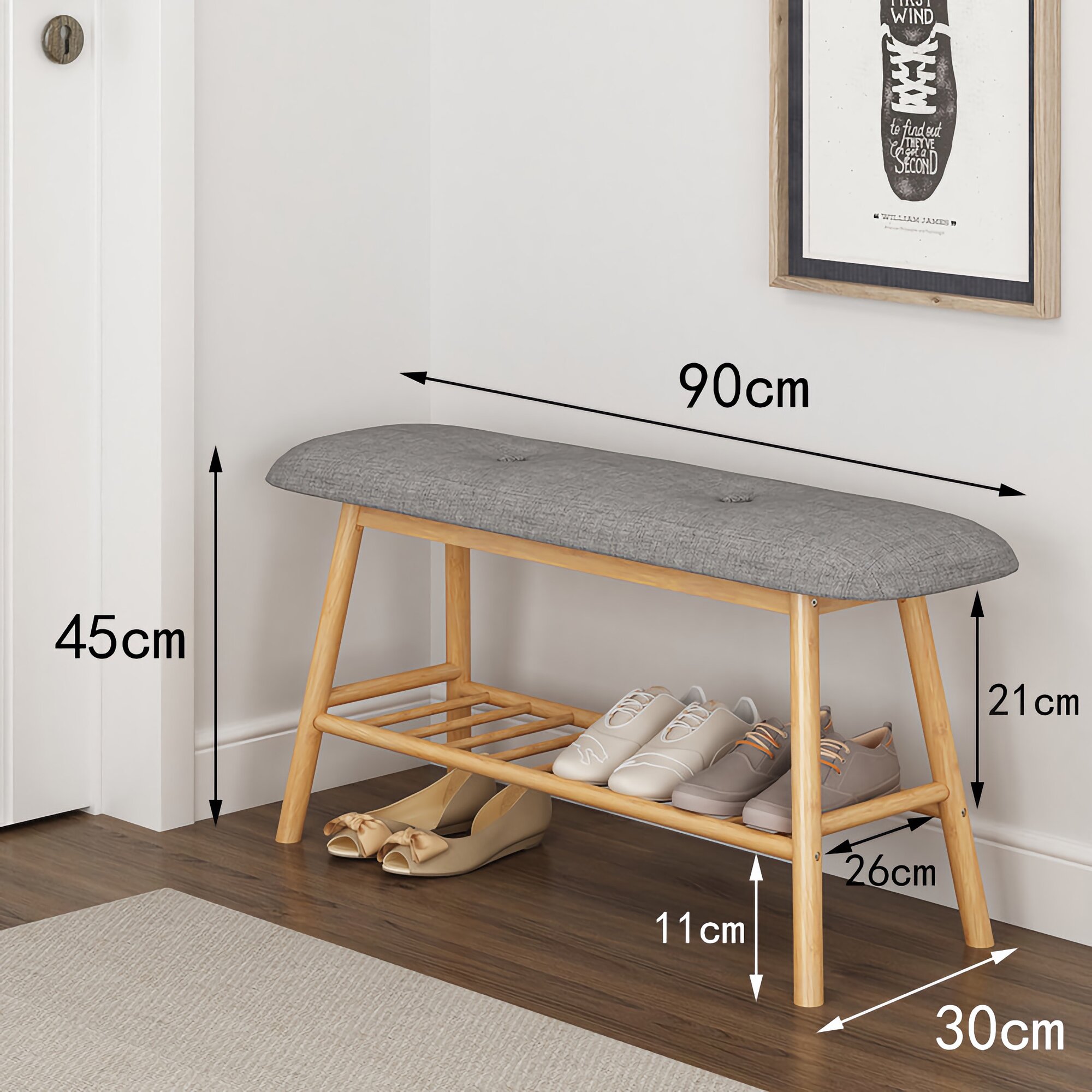 Банкетка имеет размеры 90 см в ширину, 45 см в высоту и 30 см в глубину, что позволяет разместить на ней большое количество обуви. Благодаря своим размерам, она обеспечивает достаточное пространство для хранения обуви, при этом не занимая много места в вашем доме.