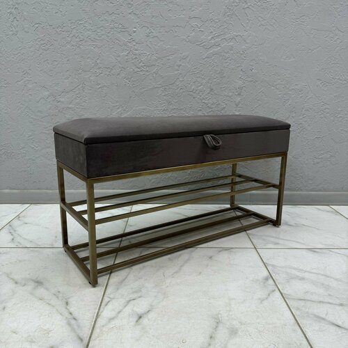 Банкетка в прихожую с мягким сиденьем, скрытым ящиком и металлическими полками сочетает в себе функции обувницы и удобного места для сидения. Под крышкой расположен вместительный отсек, куда легко убрать несколько пар обуви и аксессуары вроде перчаток или зонтов.
