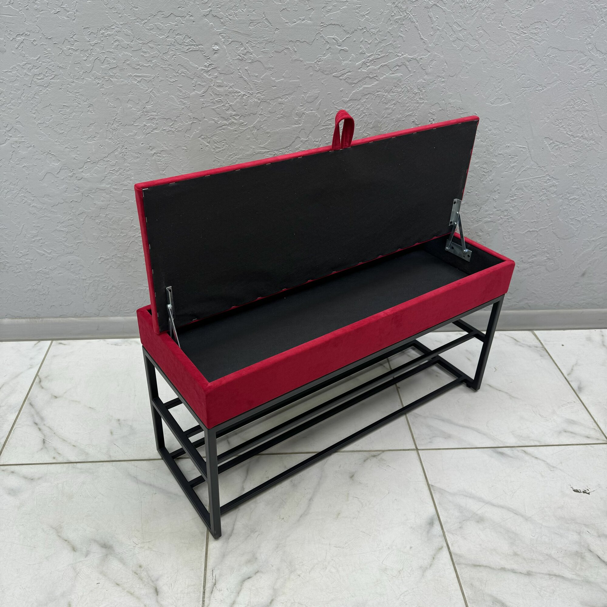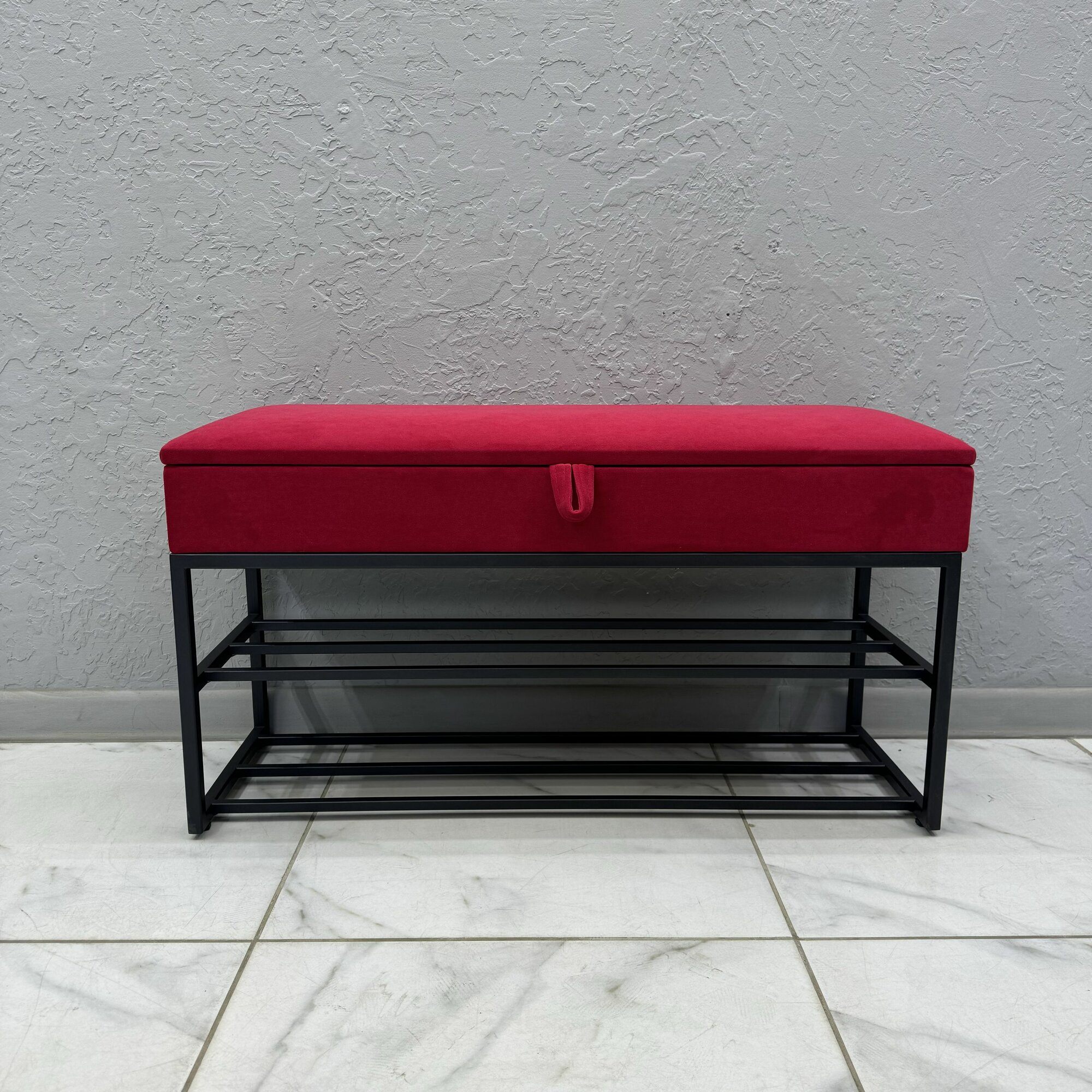 Нижние полки позволяют держать повседневную обувь под рукой, сохраняя порядок в прихожей. Сиденье обито мягким велюром: оно приятно на ощупь, хорошо переносит ежедневное использование и легко очищается. Прочный металлический каркас обеспечивает устойчивость, а универсальный дизайн подходит для большинства интерьеров.