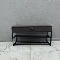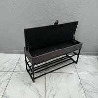 Банкетка в прихожую с мягким сиденьем, скрытым ящиком и металлическими полками сочетает в себе функции обувницы и удобного места для сидения. Под крышкой расположен вместительный отсек, куда легко убрать несколько пар обуви и аксессуары вроде перчаток или зонтов.