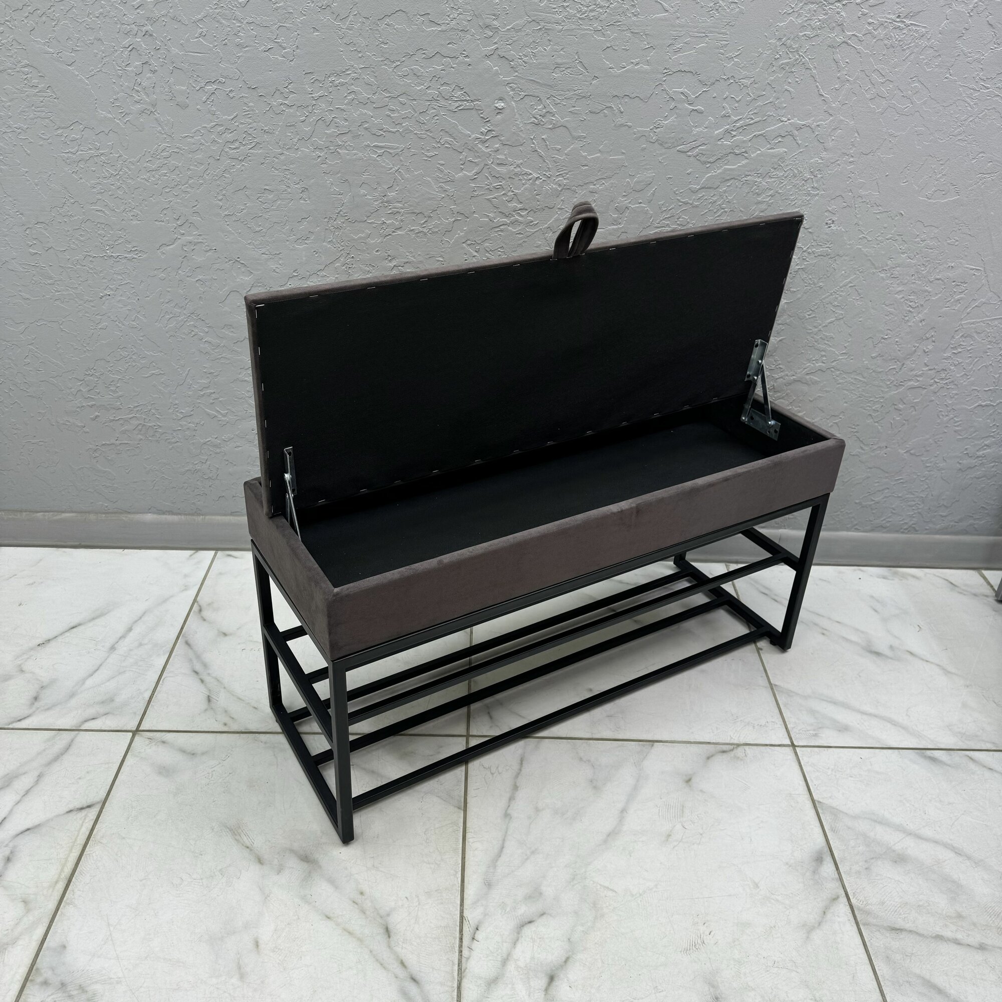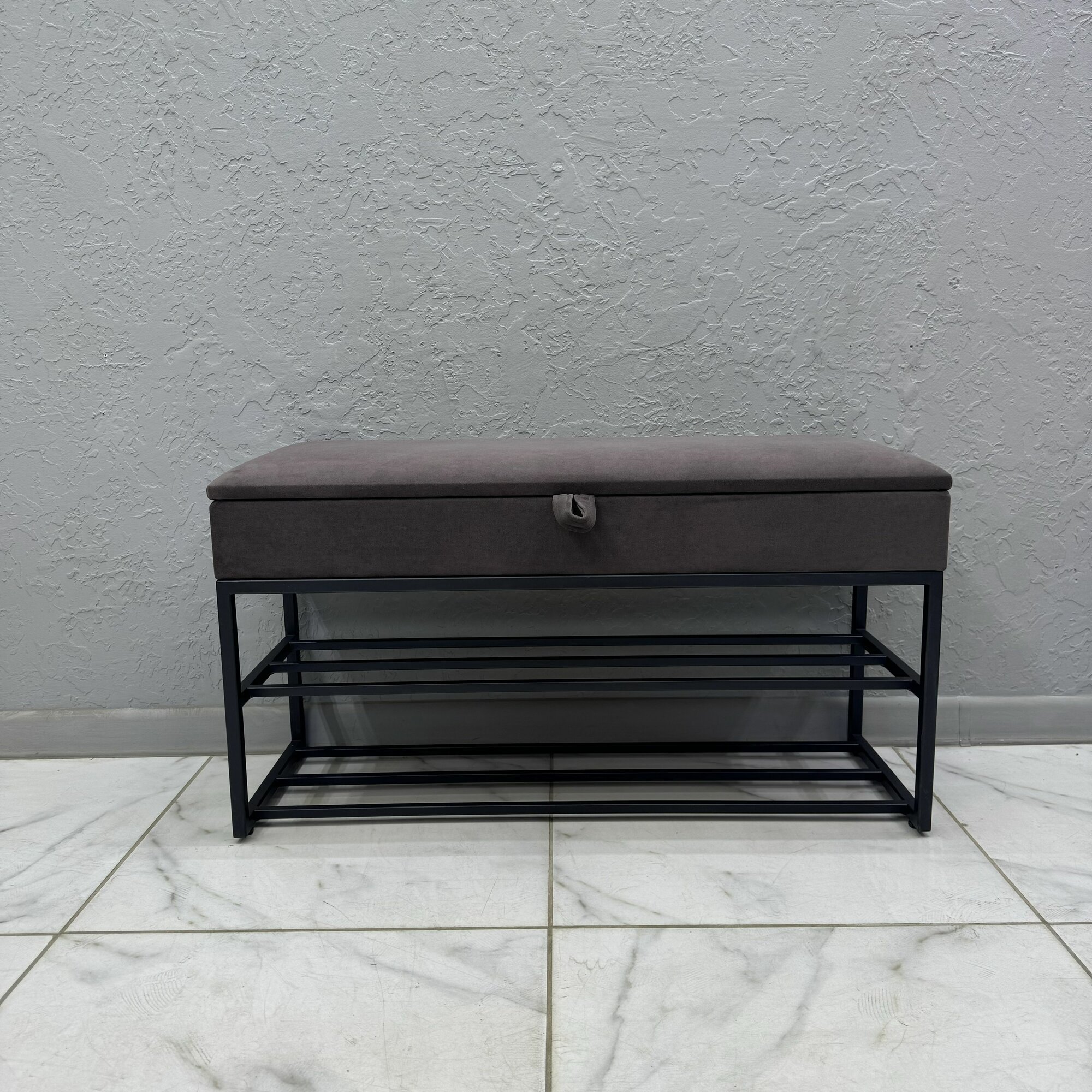 Нижние полки позволяют держать повседневную обувь под рукой, сохраняя порядок в прихожей. Сиденье обито мягким велюром: оно приятно на ощупь, хорошо переносит ежедневное использование и легко очищается. Прочный металлический каркас обеспечивает устойчивость, а универсальный дизайн подходит для большинства интерьеров.