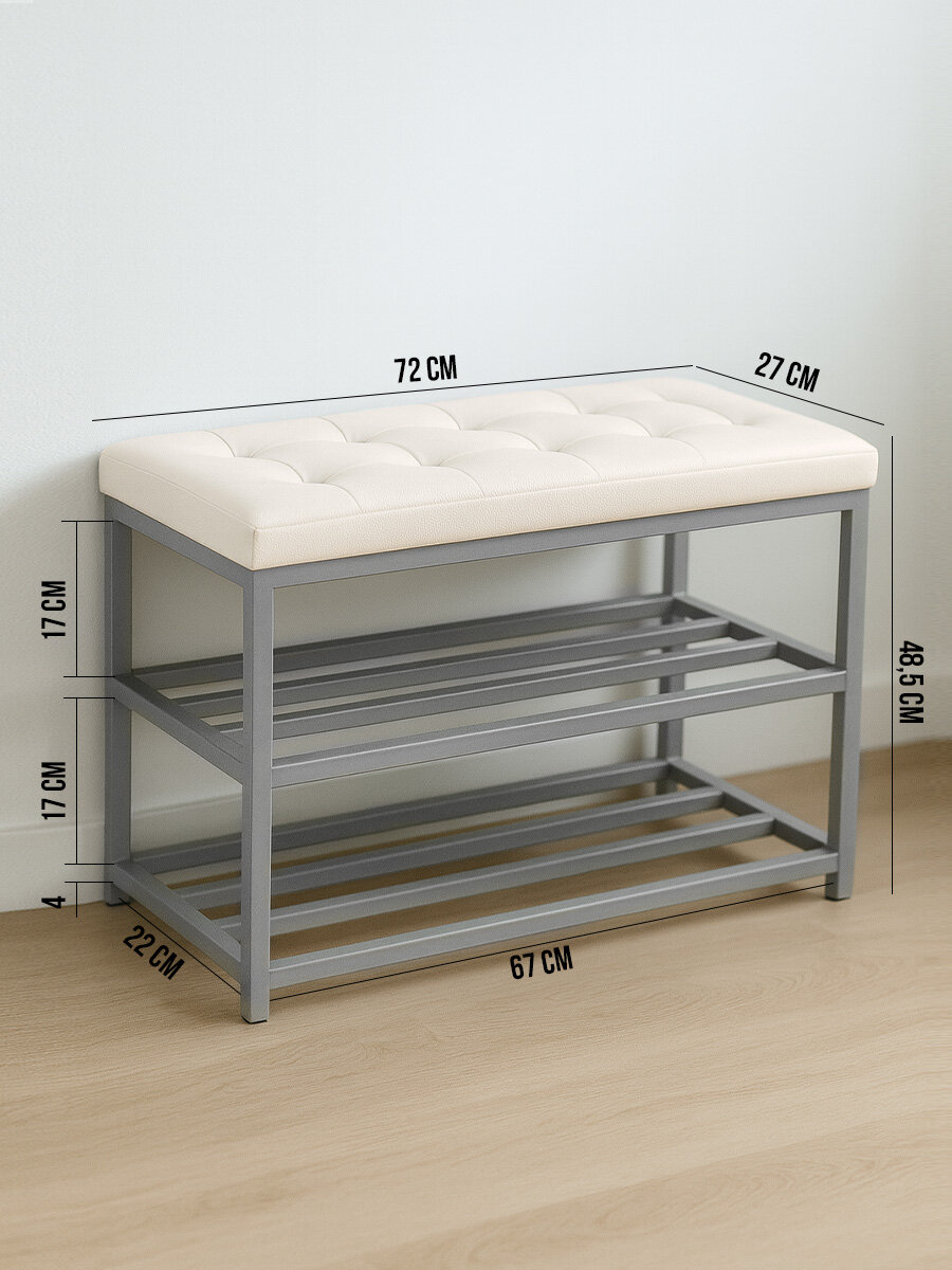 Железные ножки маленькой скамьи защищены заглушками для предотвращения царапин на полу. Этажерка с полочкой доставляется в коробке, дополнительная сборка и инструменты не требуются.