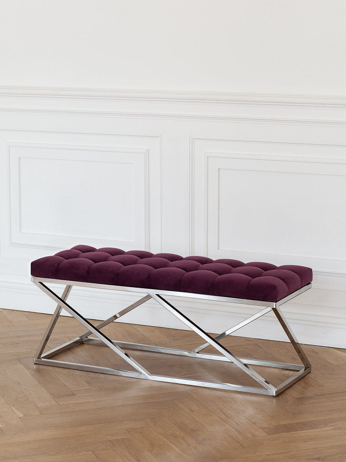 Банкетка ZUMA с каркасом из нержавеющей стали и мягким сиденьем в каретной стяжке привлекает внимание элегантным видом и комфортной посадкой. Стильная банкетка-скамья подойдет для прихожей, спальни, гостиной, гардеробной и кабинета.