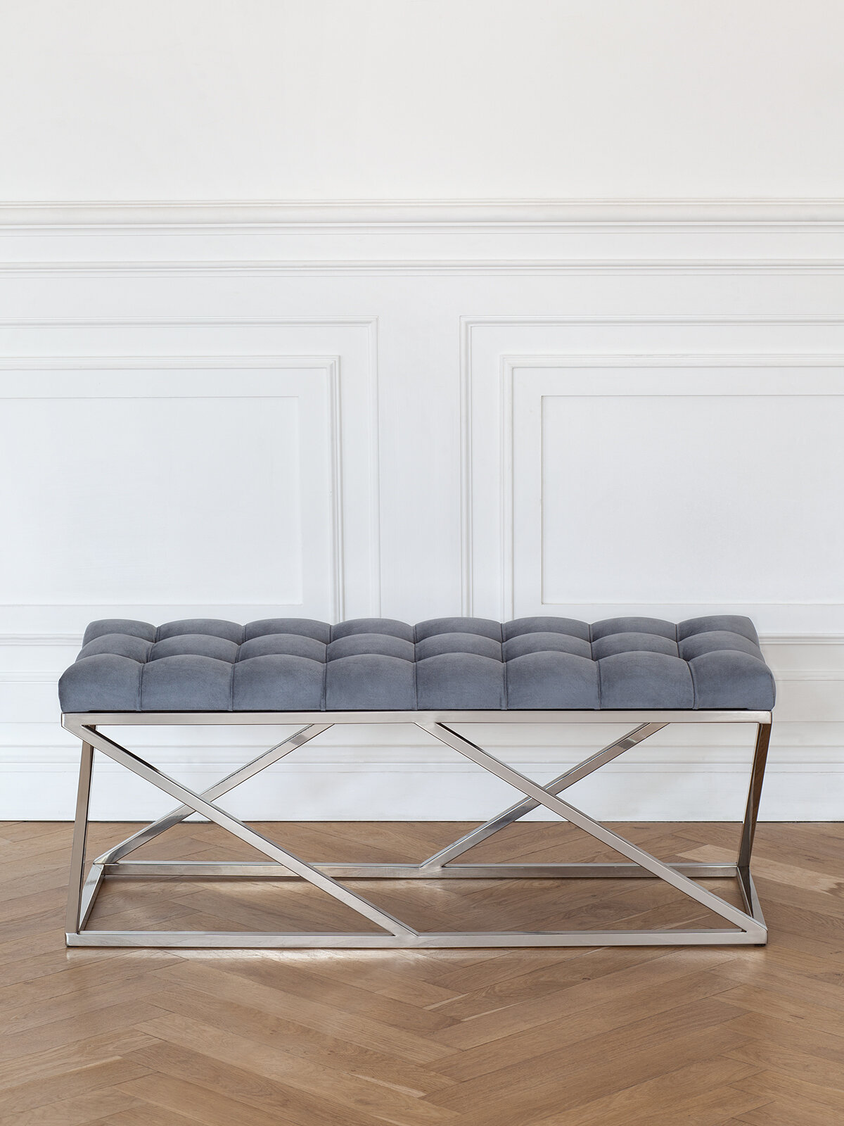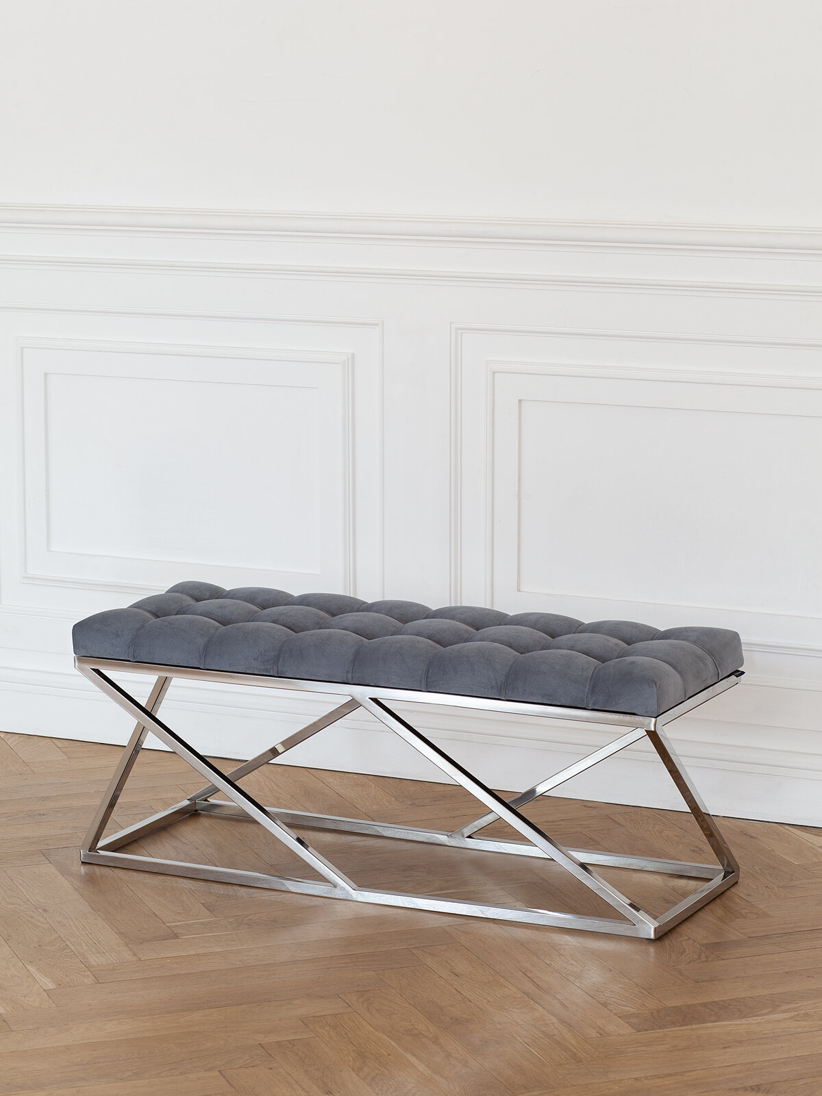 Банкетка ZUMA с каркасом из нержавеющей стали и мягким сиденьем в каретной стяжке привлекает внимание элегантным видом и комфортной посадкой. Стильная банкетка-скамья подойдет для прихожей, спальни, гостиной, гардеробной и кабинета.