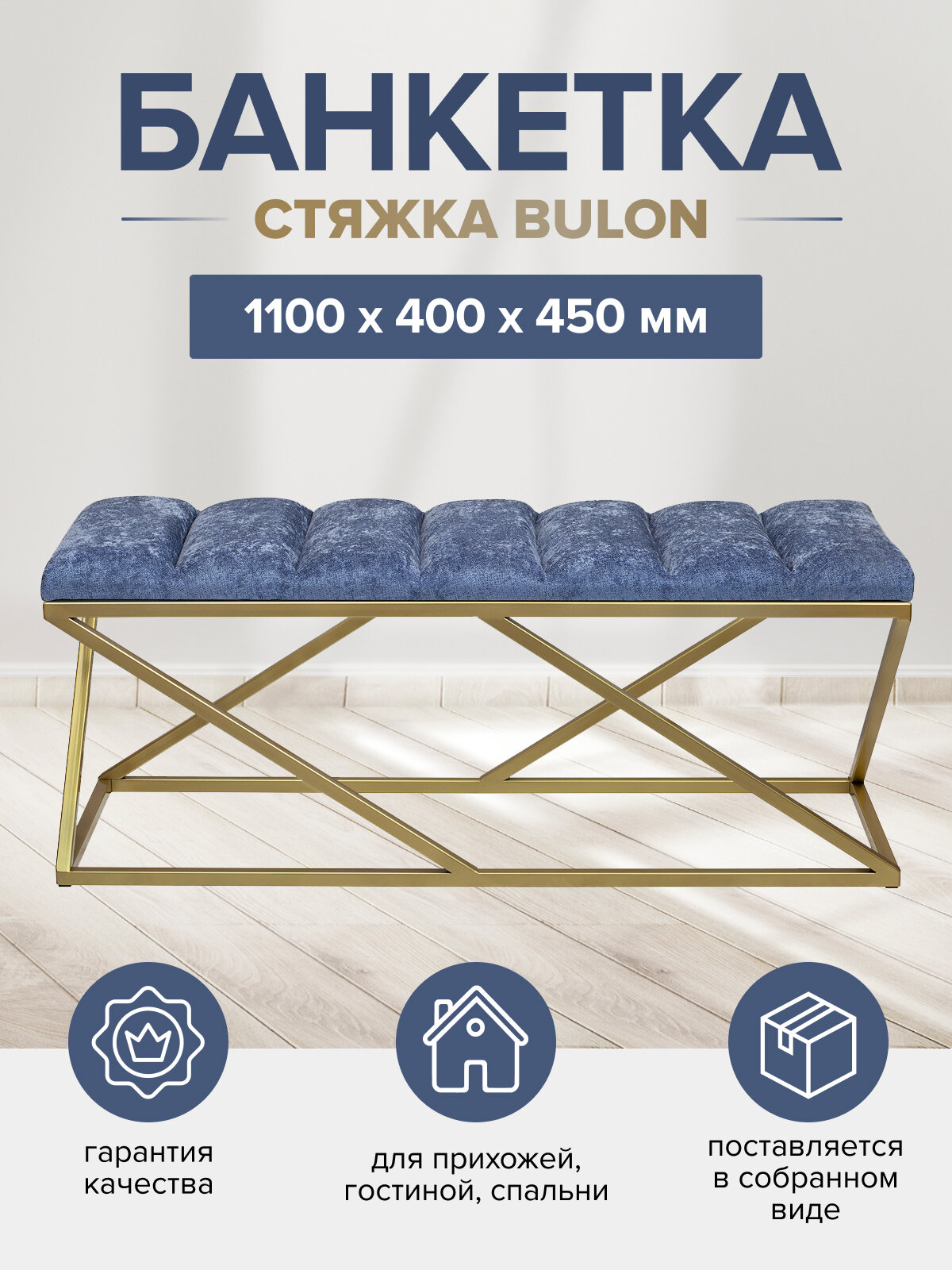 Эффектное сочетание обивки с серебристым оттенком и золотого основания банкетки понравится всем ценителям стильной мебели GreenWeen. Качественные материалы позволят надолго сохранить первоначальный внешний вид мебели. Доставляем банкетку в собранном виде в надежной упаковке.