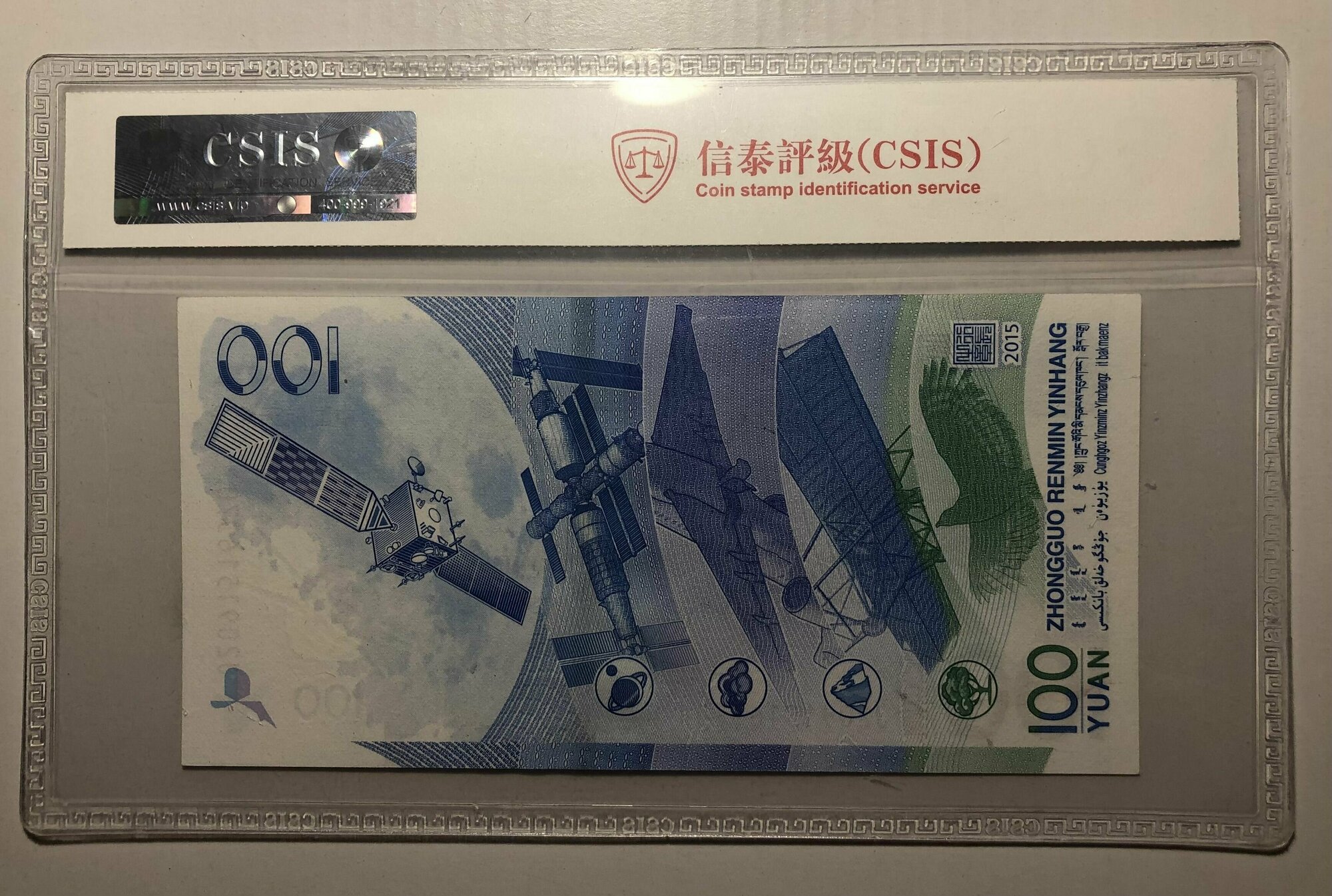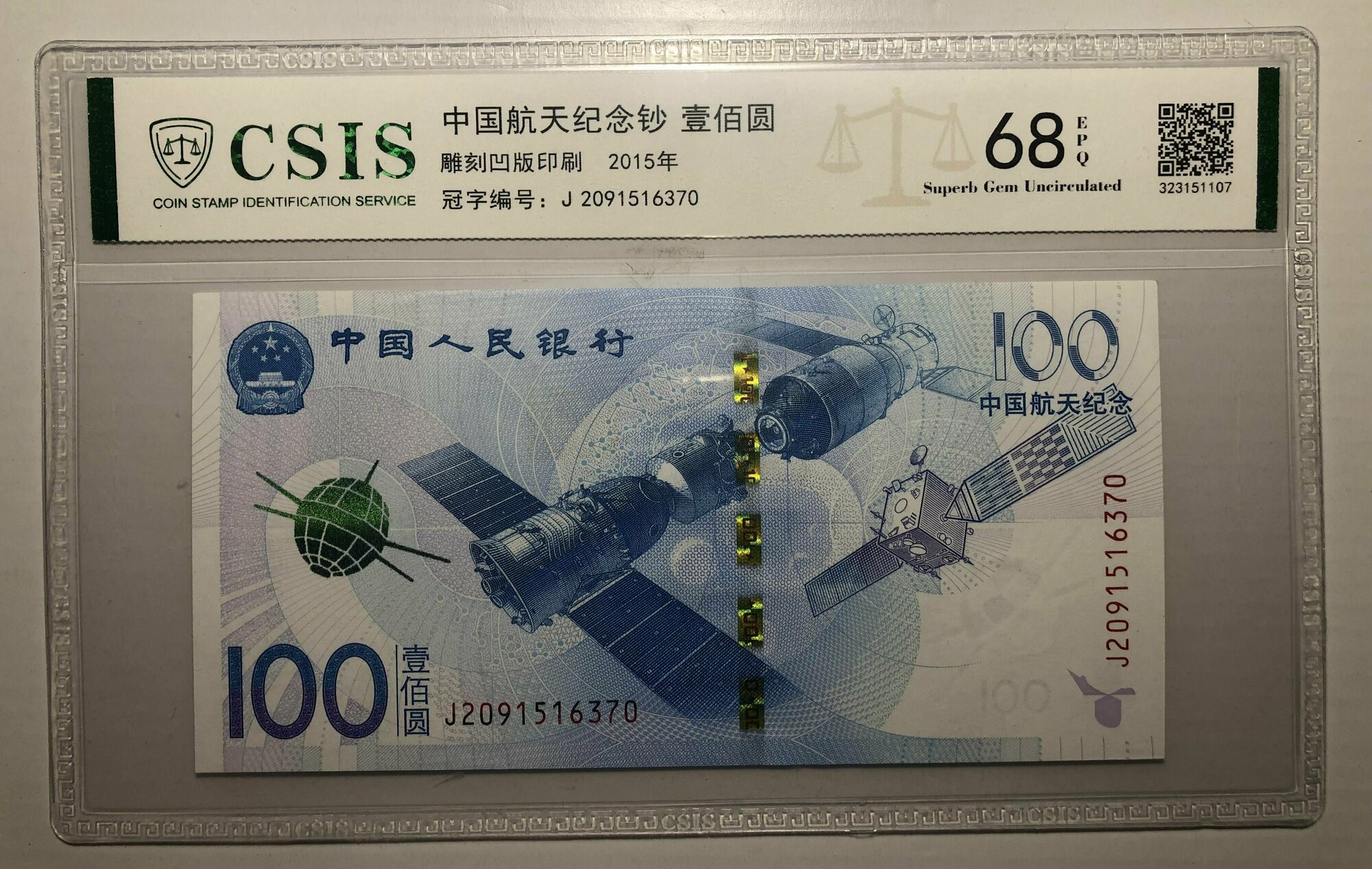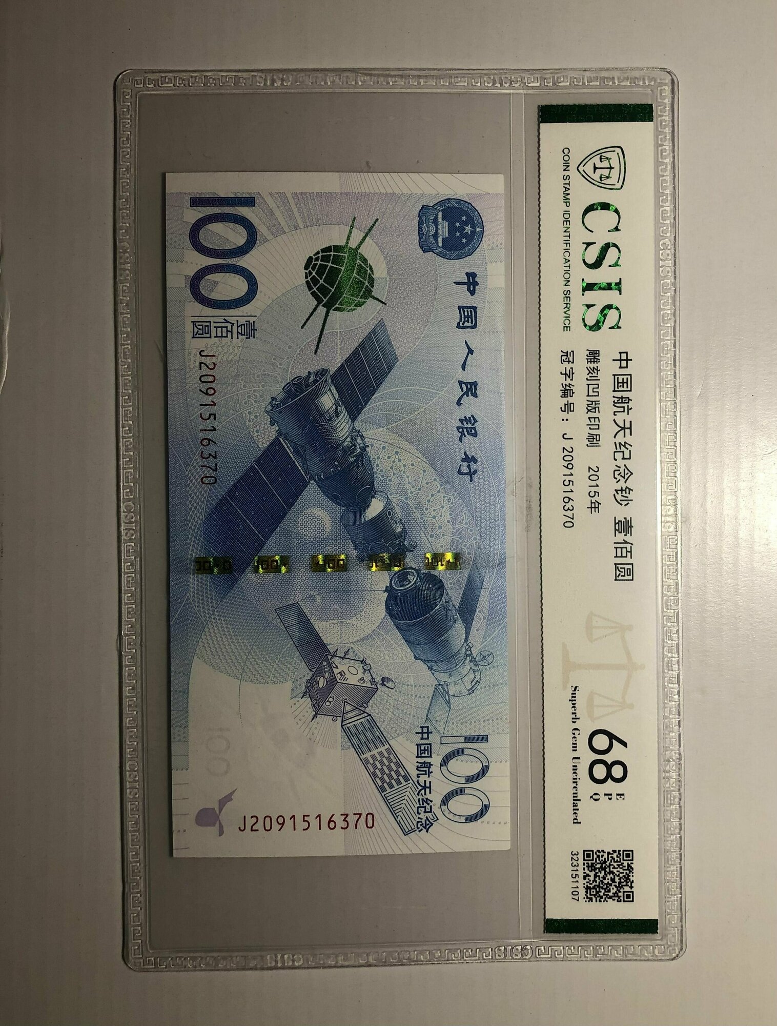 Банкнота памятная Китай 100 юаней Аэрокосмическая станция 2015 года коллекционная ! В Слабе с грейдом EPQ 68.