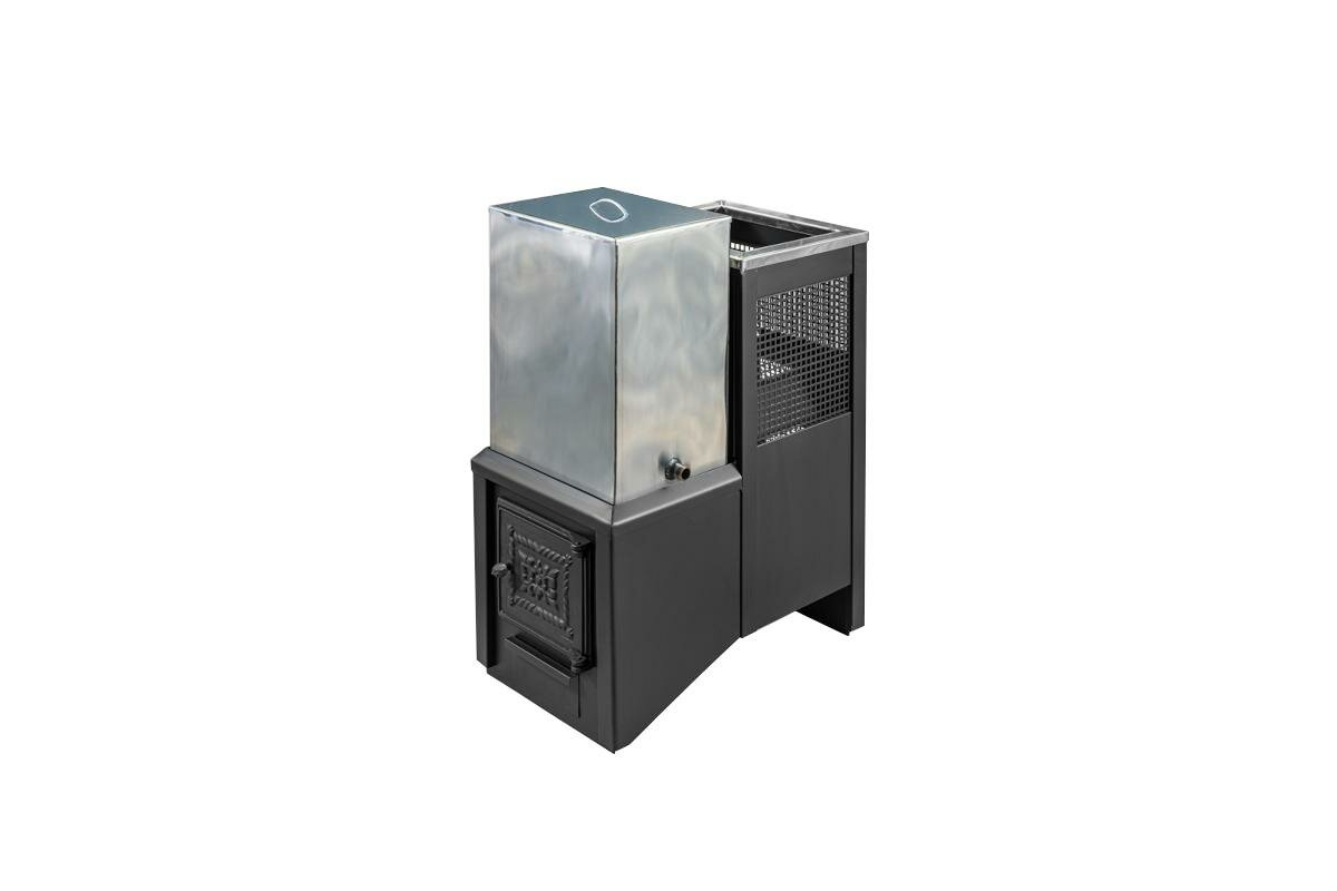 Печь банная Радуга ПБ-25Б с баком 45л, сталь 6мм арт. Р-169.1 - печь в парную с баком для воды Особенности: - сплошная чугунная топочная дверца (в базовой комплектации) - с выносом топки под обкладку кирпичом. - вместительная каменка. Рассчитана на 40 килограмм банного камня - дымоход по центру топки диаметром 115 мм - расположение печи в парной зависит только от удобства размещения дымовой трубы с соблюдением правил пожарной безопасности - конвекционный принцип нагрева парилки