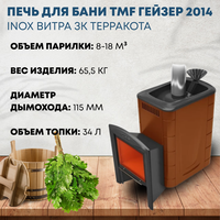 Дровяная банная печь «Гейзер 2014 Inox» является синергетическим развитием и симбиозом двух успешных печей TMF – «Гейзер» и «Ангара 2012 Inox». При этом она соединяет в себе все достоинства базовых проектов и исключает недостатки, выявленные в процессе их многолетней рыночной эксплуатации. «Гейзер 2014 Inox» рассчитан на парилки объемом от 8 до 18 м3. Её отличительной чертой является уникальная система двойного парообразования, которая позволяет получить исключительно качественный легкий пар. При этом не требуются какие-то специальные навыки профессионального парильщика. Воронка со встроенным клапаном-дозатором поможет налить именно столько воды, сколько надо, и не позволит «залить» камни. А две последовательные каменки (сначала закрытая, а потом открытая) доведут пар до нужных кондиций. Образование пара обычно сопровождается звуком, напоминающим шум камчатских гейзеров. Печь ориентирована на гурманов банных процедур и производится из жаростойкой нержавеющей стали. Каждая модель выпускается в трех вариантах дизайна: «терракота», «антрацит», «шоколад» и «беж». Предусмотрены модификации с теплообменником и модификации «Витра», оснащенные большим светопрозрачным экраном с диагональю 42 см. За счет подачи воды в открытую или закрытую каменку вы можете создавать режим парения от «русской бани» - с умеренной температурой при повышенной влажности, до «финской сауны» - с повышенной температурой и пониженной влажностью.
