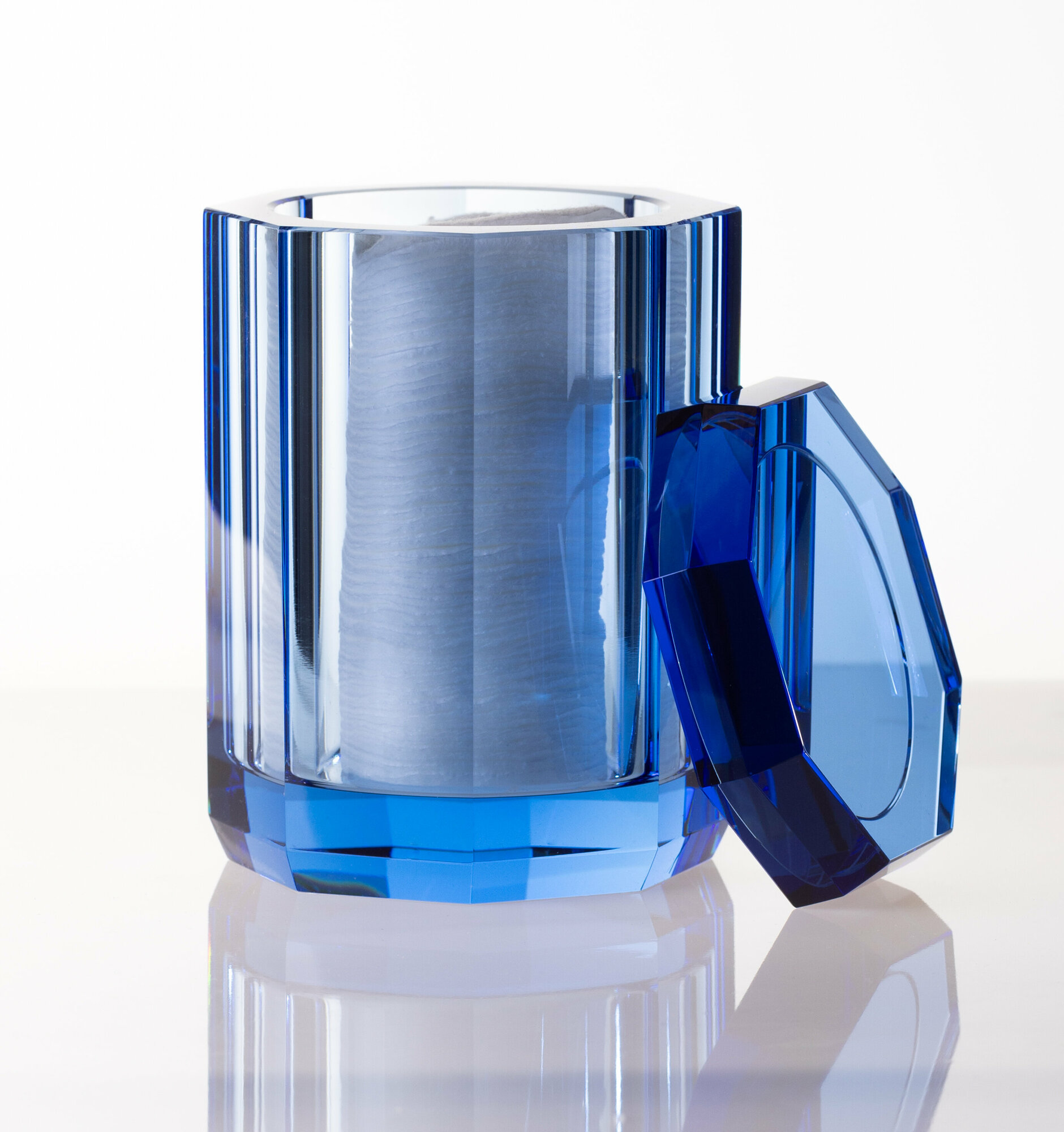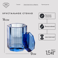Вместительная баночка 9/9/14 K&B хрустальное стекло цвет голубой, для хранения гигиенических принадлежностей поможет вам привести в порядок ванную комнату и туалетный столик. Она подойдет для ватных палочек и ватных дисков, косметики, аксессуаров и других мелочей, которые важно держать в чистом сухом месте. Баночка K&B очень вместительная, крышка позволяет защитить принадлежности от пыли, влаги и грязи. Хрустальное стекло поможет быстро определить содержимое и эстетично смотрится в интерьере комнаты. Хрустальное стекло K&B безопасно для всех вещей, устойчиво к высокой влажности (поэтому поместить контейнер можно у раковины) этот предмет интерьера очень порадует тех, кто уделяет внимание организации хранения своих гигиенических принадлежностей. Органайзер под косметические средства будет стильно смотреться на столе, полке, в шкафу или ящике - порядок и уют начинается с малого!