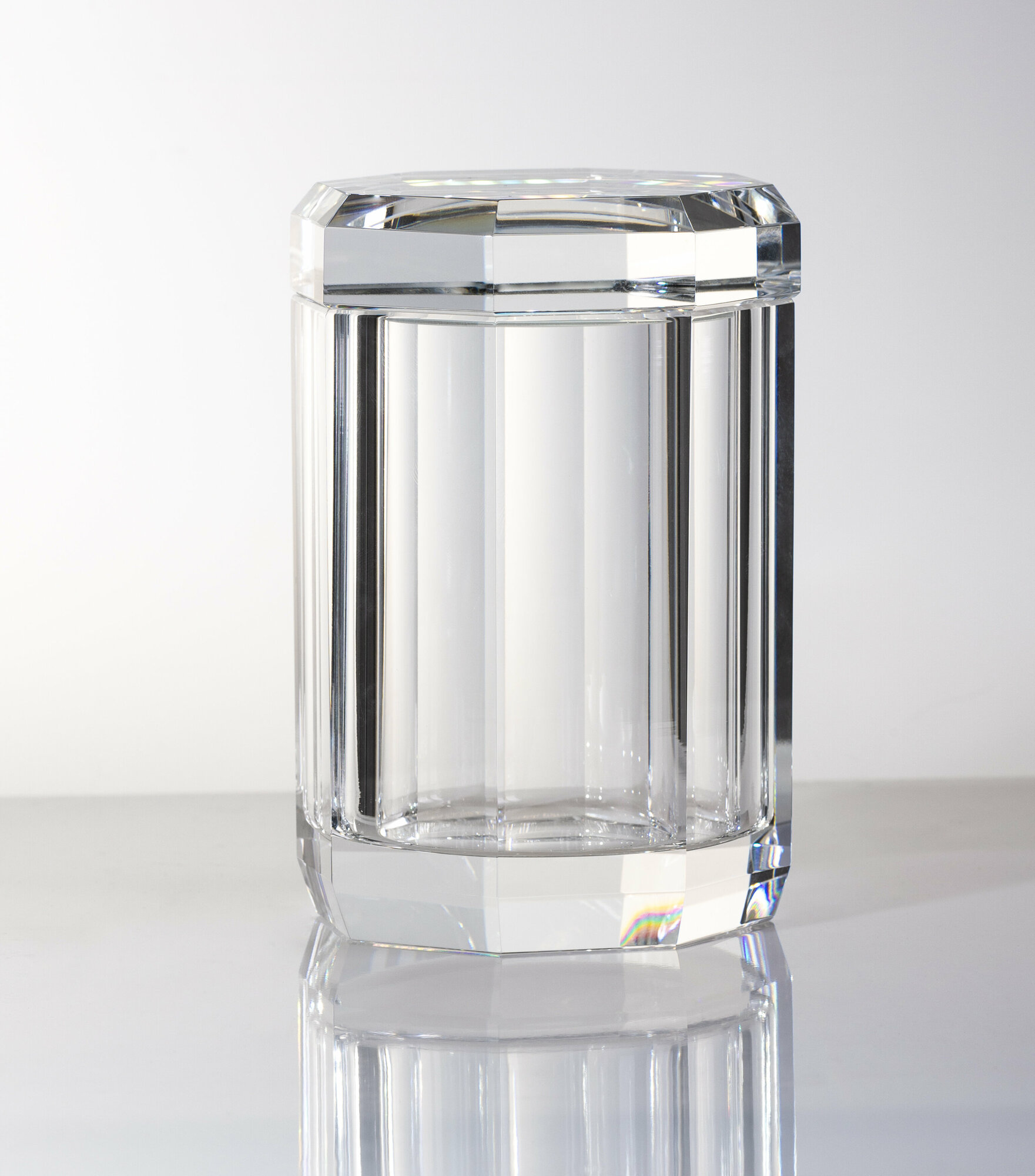 Вместительная баночка 9/9/14 K&B хрустальное стекло цвет прозрачный, для хранения гигиенических принадлежностей поможет вам привести в порядок ванную комнату и туалетный столик. Она подойдет для ватных палочек и ватных дисков, косметики, аксессуаров и других мелочей, которые важно держать в чистом сухом месте. Баночка K&B очень вместительная, крышка позволяет защитить принадлежности от пыли, влаги и грязи. Хрустальное стекло поможет быстро определить содержимое и эстетично смотрится в интерьере комнаты. Хрустальное стекло K&B безопасно для всех вещей, устойчиво к высокой влажности (поэтому поместить контейнер можно у раковины) этот предмет интерьера очень порадует тех, кто уделяет внимание организации хранения своих гигиенических принадлежностей. Органайзер под косметические средства будет стильно смотреться на столе, полке, в шкафу или ящике - порядок и уют начинается с малого!