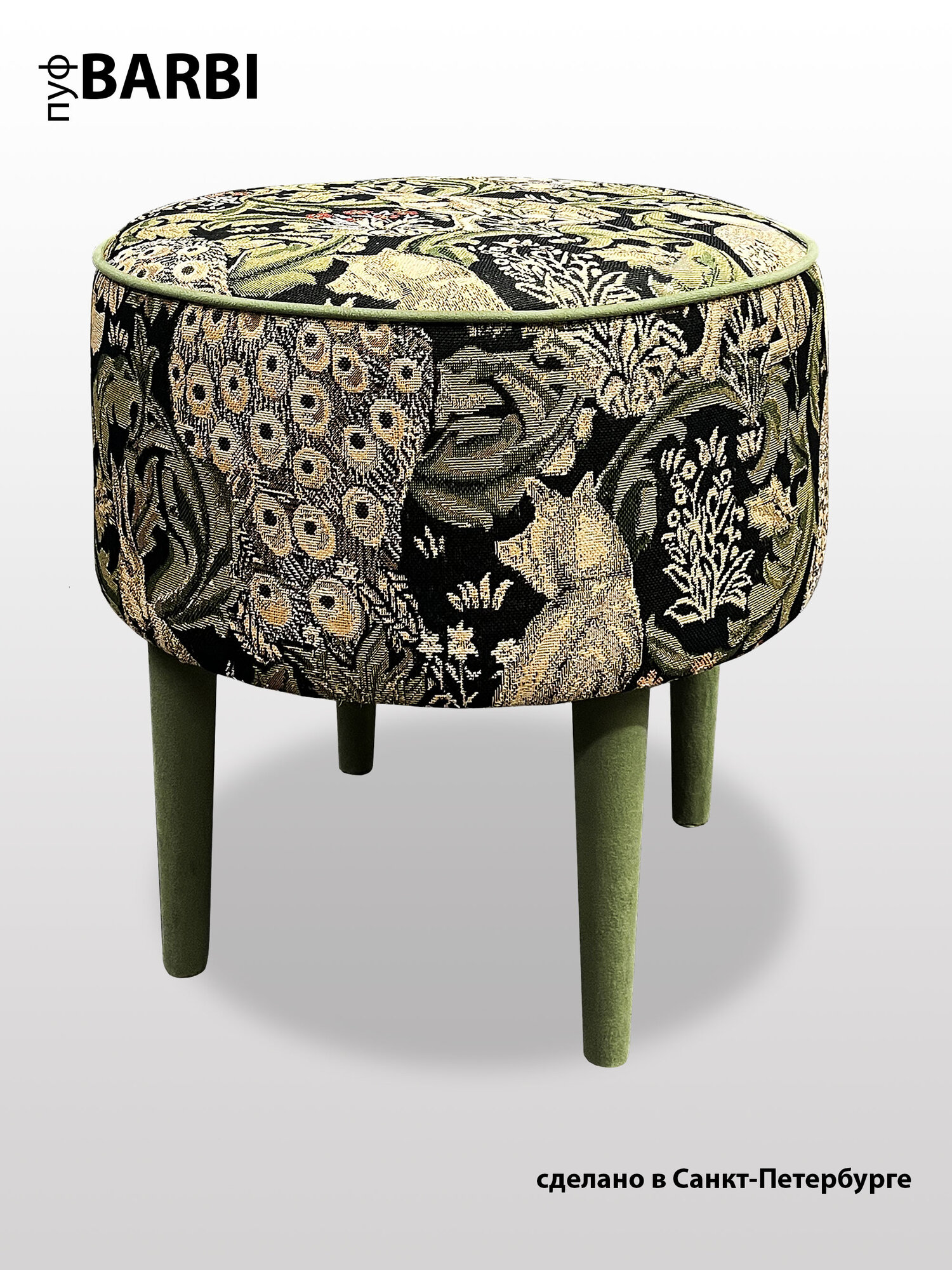 Этот яркий пуф станет стильным акцентом в вашем доме. Вгимание к деталям, качественная обивка из мебельного гобелена, контрастный кант и тканевые ножки в цвет канта создают неповторимый дизайн. Каркас пуфа выполнен из березовой фанеры, что обеспечивает экологичность изделия, прочность и при этом легкость для комфорта перемещения даже ребенком. Сиденье средней жесткости с высокоэластичным ппу высотой 40мм. Ножки высотой 22см с фетровыми накладками для дополнительной защиты пола от царапин. Компактный пуф Barbi-идеальное сочетание стиля, комфорта и качества для вашего дома.