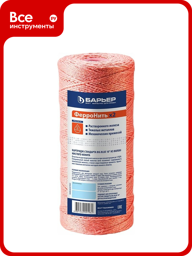 Фильтроэлемент ФерроНить х2 BB 10 Барьер Р442Р03 предназначен для очистки холодной воды от растворенного железа, тяжелых металлов и нерастворимых механических загрязнений. Изготовлен из волокнистого материала. Используется в магистральных фильтрах Барьер стандарта Big Blue 10".