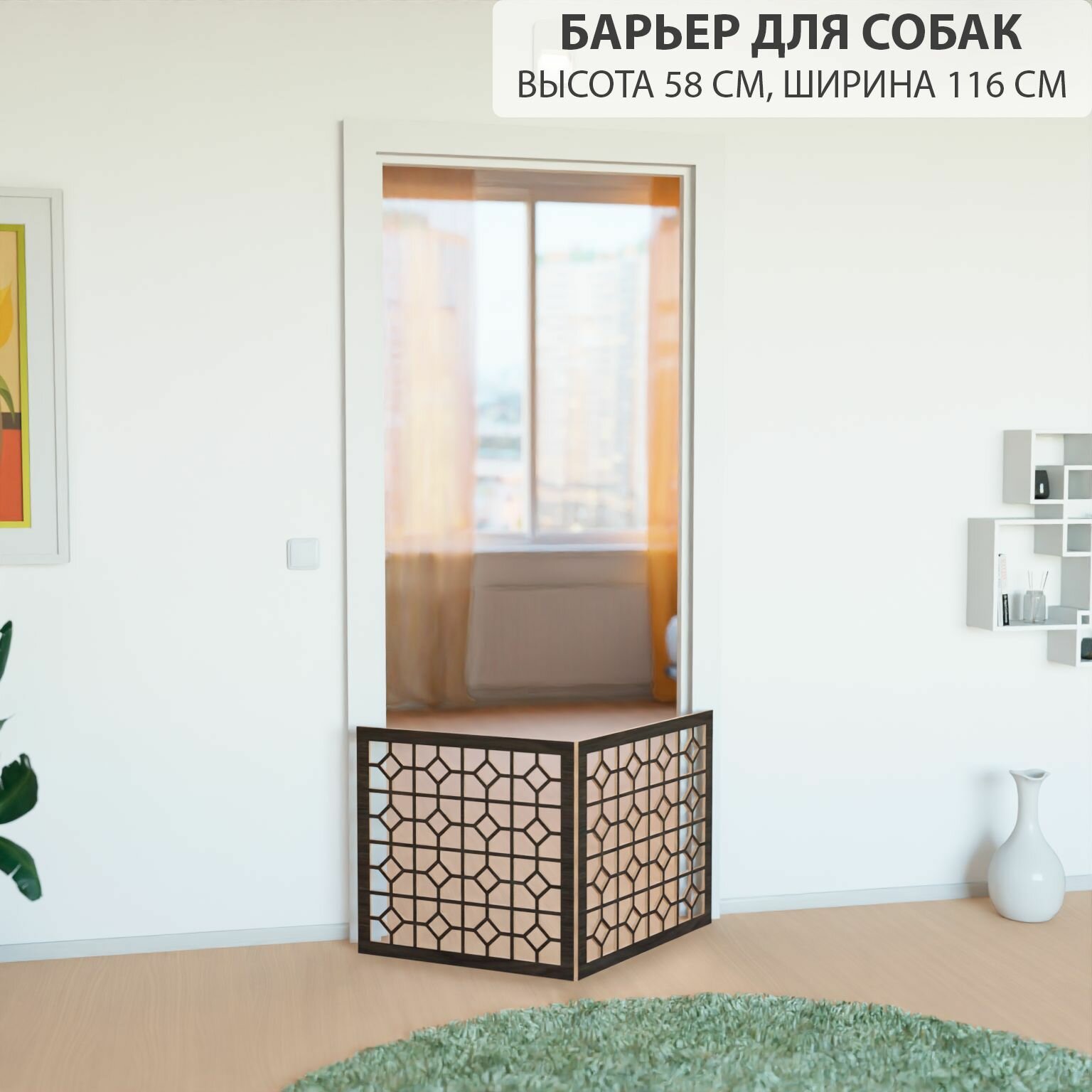 Элегантная ширма для интерьера, идеально подходит для ограничения свободного перемещения мелких собак и кошек. Изготовлена из прочного ламинированного МДФ в цвете венге, с песочными акцентами, которые видны на торцах и внутри резьбы.