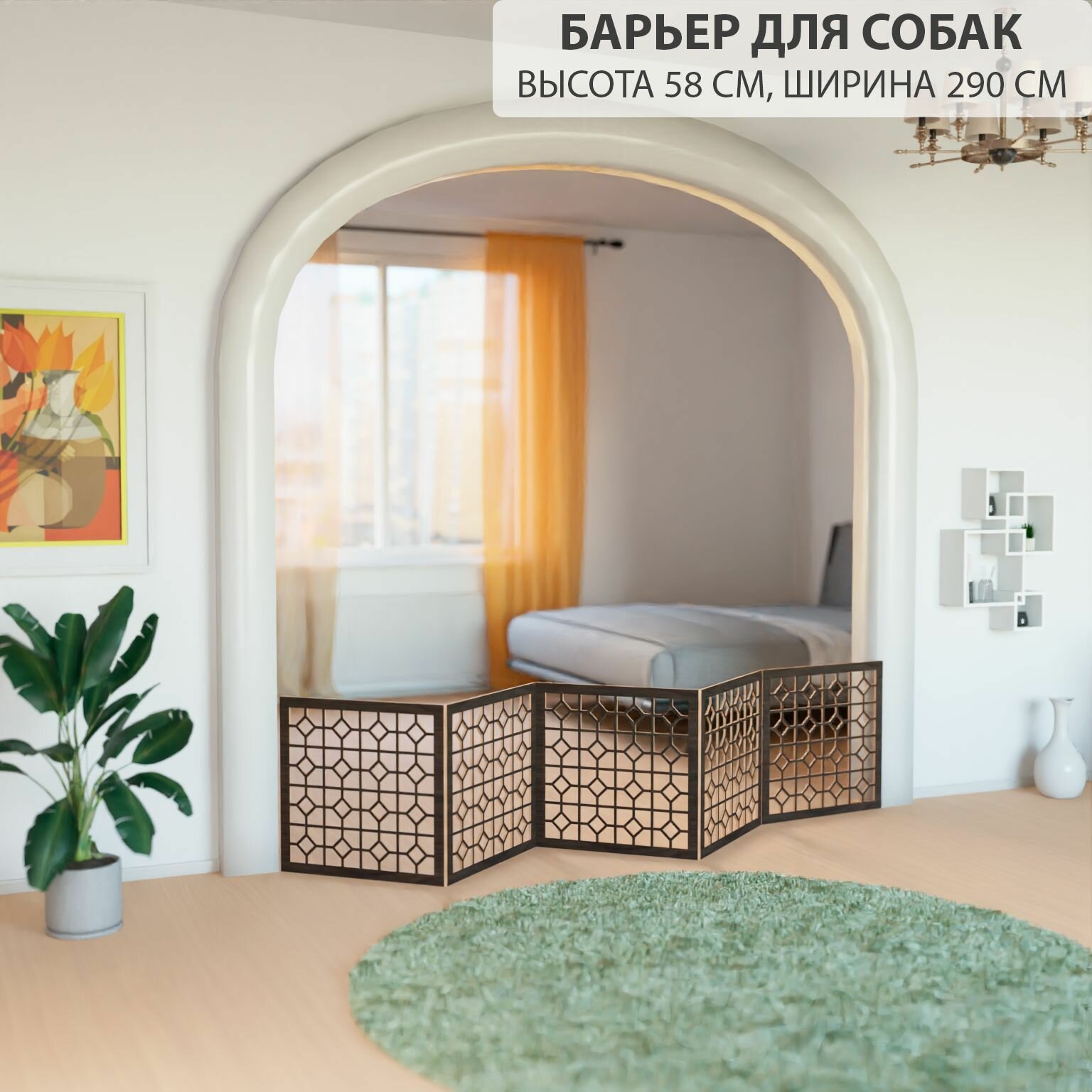 Элегантная ширма для интерьера, идеально подходит для ограничения свободного перемещения мелких собак и кошек. Изготовлена из прочного ламинированного МДФ в цвете венге, с песочными акцентами, которые видны на торцах и внутри резьбы.