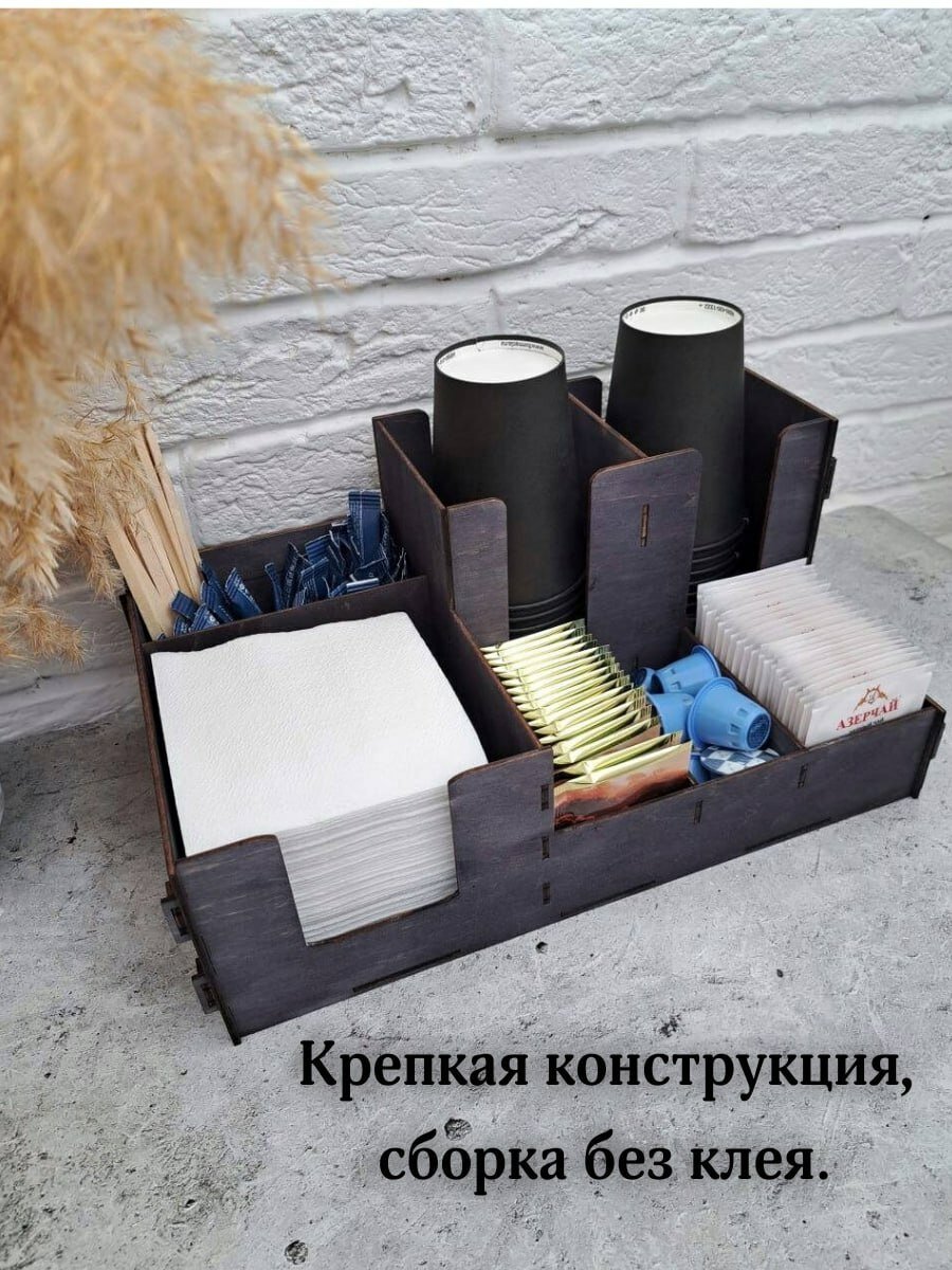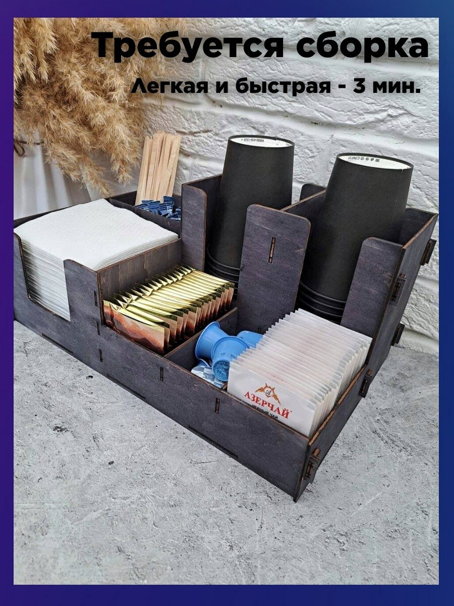 Подставка для чая и стаканов кофе, салфеток удобен в уходе за счет износостойкого и влагостойкого покрытия.