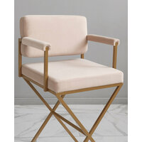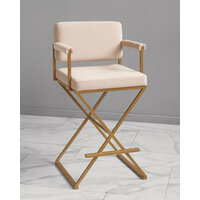 Режиссерский барный стул для визажиста или бровиста. Каркас выполнен из металла с порошковым окрашиванием в матовый черный цвет. Это стул не складной, в отличие от аналогов, поэтому его конструкция надежная и устойчивая. Обивка выполнена из велюра бежевого цвета. Мягкие сиденье, спинка и подлокотники позволят клиенту сидеть с комфортом даже длительное время. Габариты: Ширина: 55 см Глубина: 56 см Высота сиденья: 78 см