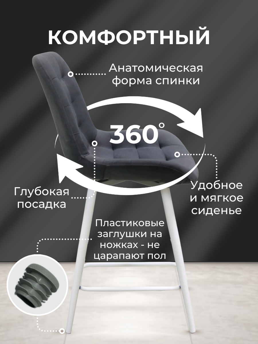 Полубарный стул оснащен поворотным механизмом на 360°, что обеспечивает максимальное удобство в использовании. Вы можете легко повернуться на сиденье, не отодвигая стул, что делает его идеальным выбором для кухонного острова, барной стойки или любого другого места в вашем доме.