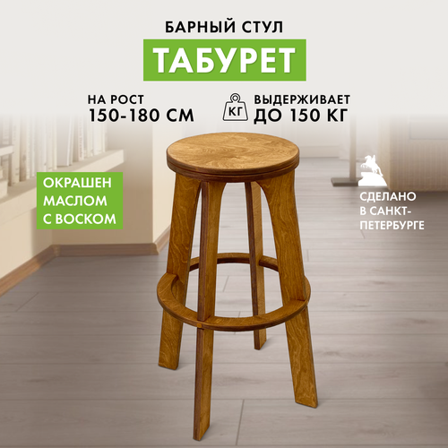 Стул барный изготовлен из натуральной березовой фанеры на высокоточном оборудовании. Стул деревянный, поверхность тщательно отшлифована и покрыта натуральным мебельным маслом с 30%-ым содержанием воска. Это обеспечивает долговечность и прочность конструкции, а также приятный внешний вид.
