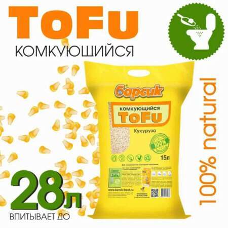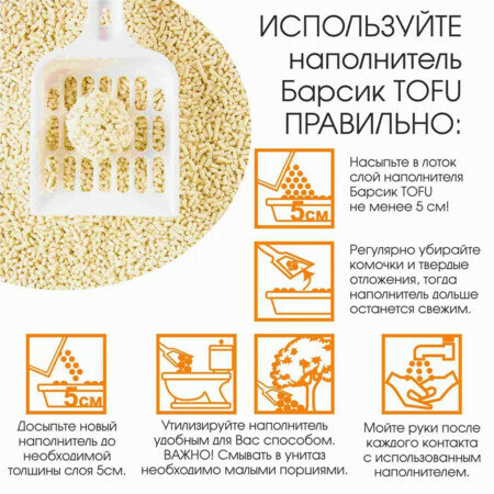Гигиенический наполнитель Барсик «тофу» – высококачественный натуральный комкующийся наполнитель для кошачьего туалета, с легким естественным ароматом. Гранулы имеют светлый, нежный оттенок, великолепно смотрится в лотке. Первый тофу - наполнитель высокого качества, произведенный в россии! Линейка наполнителей Барсик TOFU - высококачественные комкующиеся наполнители на основе натуральных растительных волокон и соевой клетчатки. Особенности и свойства: - комкующийся - эффективно впитывают влагу, образуя плотный компактный эластичный комок, который легко удалить из общей массы наполнителя, не прилипает к стенкам лотка; - надолго блокирует неприятный запах. Сам наполнитель обладает легким и приятным ароматом. - разрешена утилизация малыми порциями в унитаз! что очень удобно для жителей квартир, т. к. теперь не нужно задумываться и совершать лишних действий для утилизации использованного наполнителя. - 100% натуральный, экологически чистый продукт, безопасный для животных, человека и окружающей среды! - гипоаллергенный, безопасен при проглатывании! - биоразлагаемый, компостируемый! За счет натурального состава и природных компонентов, наполнитель быстро разлагается в почве не нанося вреда экологии. Может быть утилизирован путем компостирования, сжигания или выброшен в контейнер, как бытовые отходы. - экономичный в использовании, за счет образования плотного компактного комка и эффективной борьбы с запахом (при правильном использовании наполнителя) наполнитель расходуется очень экономично. - Практичная фракция гранул диаметром 4мм, не прилипает к шерсти и лапам питомца, не «разносится» по комнате. - Подходит для котят, взрослых кошек, кастрированных, стерилизованных. Для приучения К лотку. - Если вы ищете наполнитель для кошачьего туалета без запаха, мы рекомендуем попробовать Барсик «тофу» ORIGINAL»! В лоток рекомендуется насыпать слой 5-7 см, такое количество позволяет быстро впитывать жидкость и хорошо удерживать запах. Представлен в трех объемах: 4,54 л, 15 л, 30 л; в весе 2,3 кг, 8,2 кг и 16,3 кг соответственно. Указанный объем – это впитываемость наполнителя. Диаметр гранул наполнителя Барсик Тофу – 0,4 см, длина гранул – от 0,6 до 1 см.