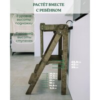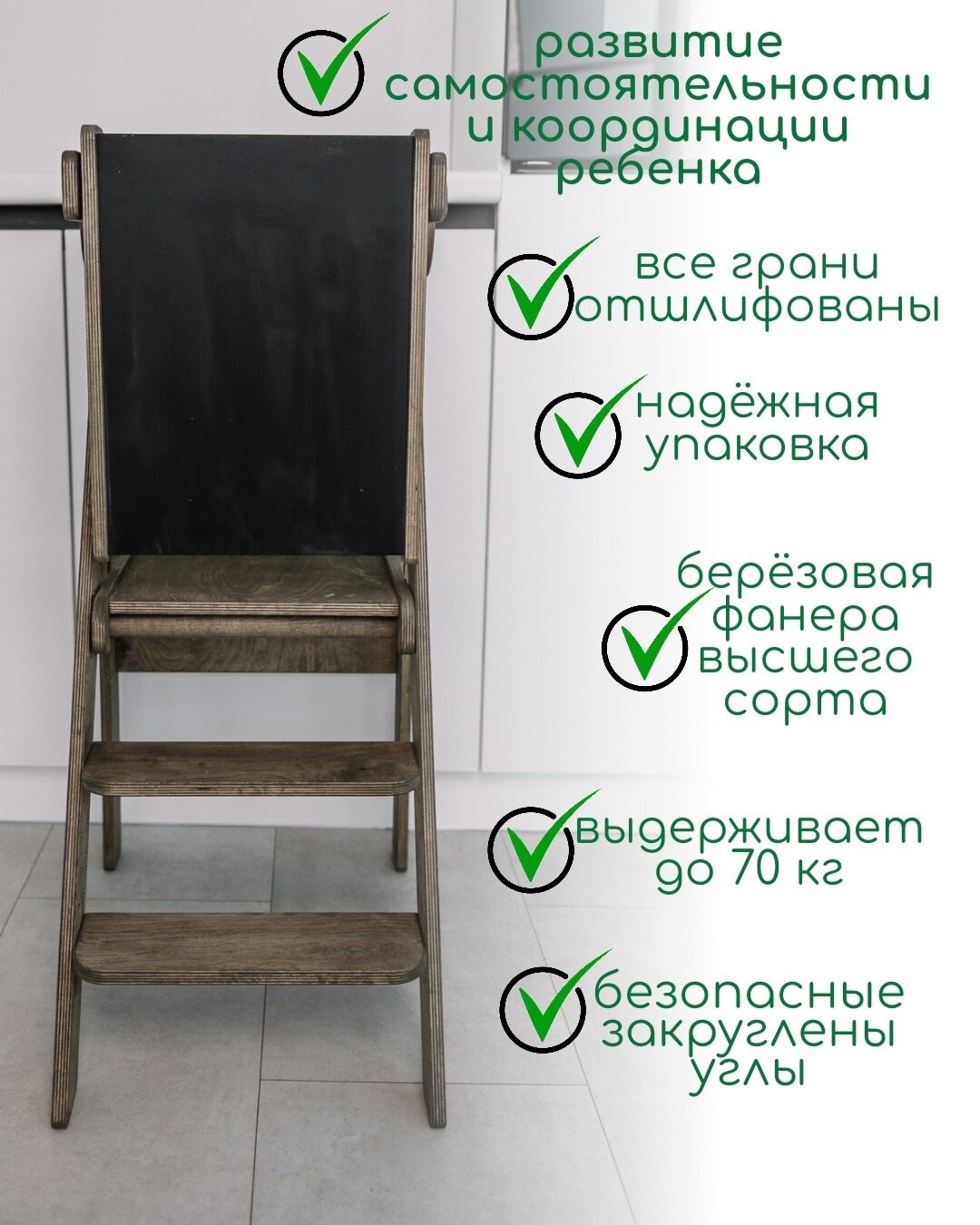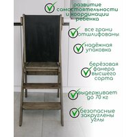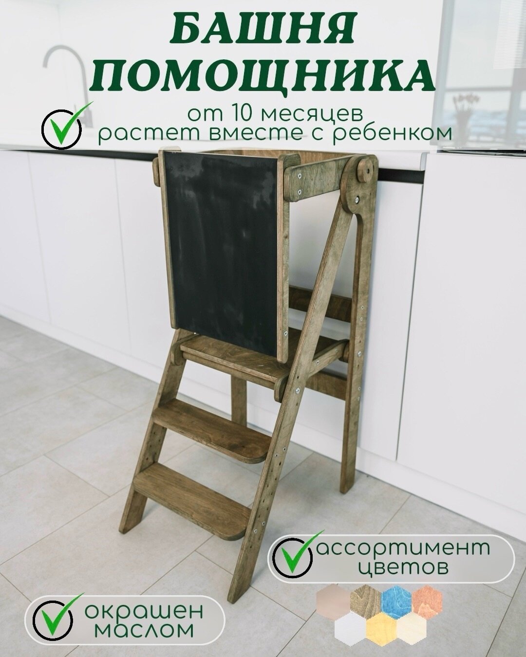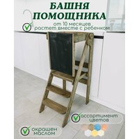 Складная компактная башня помощника Монтессори, для детей, выполнена из натурального дерева высшего сорта. Устойчивая конструкция, которая гладко отшлифована, покрыта маслом. Грифельная доска для рисования ( идет в комплекте ) станет отличным местом для творчества, также прослужит защитой от падения. Башня регулируется по высоте под рост ребенка. Простая удобная сборка, где используется качественная фурнитура. Её можно использовать как стул, а так же стремянку для взрослого человека. Развивает самостоятельность ребенка. Кнструкция крепкая, удобная и безопасная, подходит для любого возраста вашего ребенка.