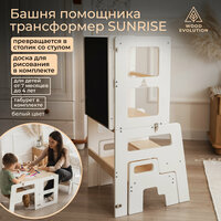 Башня помощника-стол в комплекте с доской для рисования от бренда Woodevolution, покрыты лаком и белой эмалью на водной основе безопасными для детей (EN71-3), серия SUNRISE - с помощью башни малыш сможет почувствовать себя взрослым и быть на одной высоте с родителями, вместе с ними изучая взрослые дела. Дети с легкостью почистят зубы во взрослом умывальнике в ванной или достанут до кухонной раковины, помощник с самого детства будет учиться на своих ошибках и прививать себе привычку к помощи взрослым. Табурет(ступенька) предоставляется в комплекте. Башня многофункциональна и ее можно использовать как стол, у ребенка появится собственное пространство для приема пищи и развития. Табурет-стремянку можно поставить рядом и помогать малышу или посадить за стол ещё одного ребенка. Табурет будет полезен и взрослым, даже папы смогут использовать его как подножку, чтобы дотянуться до верхних полок. Грифельная(графитовая) доска и мелки для рисования предоставляются в комплекте, они создают дополнительную творческую зону вокруг изделия, где ребёнок будет с радостью проводить время. Башня разрабатывалась по методикам исследователей детского развития Монтессори и Пиклер, поэтому детскую мебель от нашего бренда можно использовать в целях развития малышей. Выдерживает нагрузку до 90 кг. Весит всего 7 кг, что позволяет очень просто ее переносить, что соответствует принципам ikea(икея). Габариты изделия идеальны для использования в квартире, высота башни соразмерна с высотой кухонной стойки или умывальника в ванне. Ступень и платформа для стояния находятся на оптимальной высоте от пола, данные расстояния от земли комфортны для детей, подходят детей ростом от 75 до 130 см. Для безопасности имеется верхний ограничитель и дополнительный съёмный, они не дадут детям выпасть из башни. Башня станет отличным подарком - сыну или дочке, внуку и внучке, на день рождения, на новый год, рождество, 8 марта или 23 февраля, на 1 год годик, именины. Изготовлена из экологически чистых материалов. Срок службы 10 лет, гарантия 1 год.