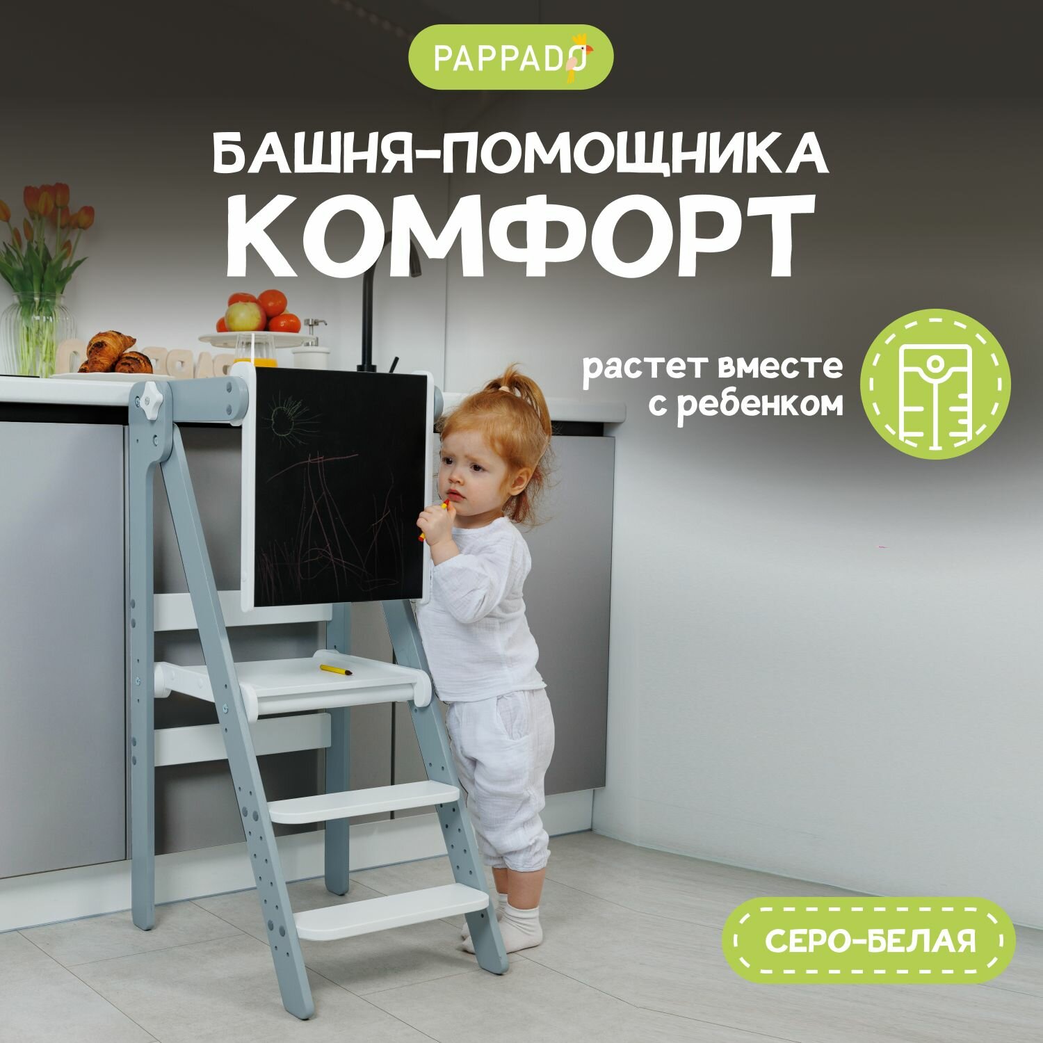 Башня помощника PAPPADO благодаря гибкости вариантов использования сделает для ребенка доступными множество возможностей, здесь все под рукой и открывается простор для творчества. Минимализм дизайна, которым отличается растущий стул для детей, позволяет легко вписать его в интерьер любой комнаты — ему не помешает шкаф детский, детская кухня деревянная станет компаньоном в игре.