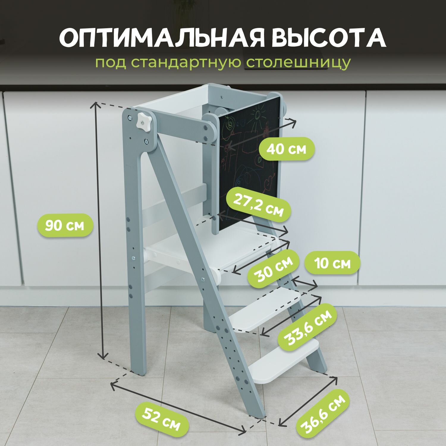 Растущий стул реально способен расти — ведь позже он отлично послужит школьнику развивать таланты в рисовании, например. Башня помощника детская изготовлена из экоматериалов с любовью: из тщательно отшлифованной березовой фанеры.