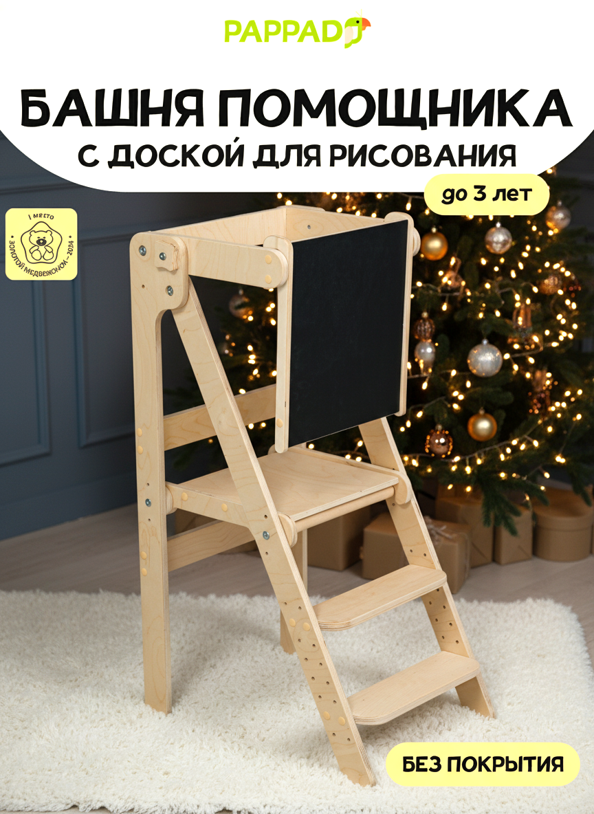 ✔ Соответствует принципам Монтессори — развивает самостоятельность ✔ Многофункциональность — заменит стульчик, подставку и ступеньку ✔ Качество материалов — прослужит долгие годы ✔ Доска-ограничитель — не просто барьер безопасности, но и грифельная поверхность, на которой можно рисовать. ✔ В 2025 году "Башня маленького помощника" компании PAPPADO стала победителем премии Золотой медвежонок в номинации Лучшая детская мебель!