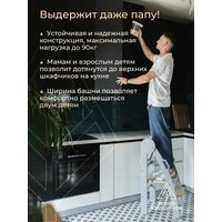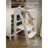 Складная башня маленько помощника от бренда Woodevolution, цвет - серые боковины, покрыта лаком на водной основе безопасным для детей, серия SUNRISE - многофункциональный инструмент для вашего ребенка, с помощью него малыш сможет почувствовать себя взрослым и быть на одной высоте с родителями, вместе с ними изучая взрослые дела и обязанности. Дети с легкостью почистят зубы во взрослом умывальнике в ванной или достанут до кухонной раковины, помощник с самого детства будет учиться на своих ошибках и прививать себе привычку к порядку и помощи взрослым. Башню можно использовать как растущий стул, ступень, стремянку трансформер или табурет. Продукт разрабатывался по методикам исследователей детского развития Монтессори и Пиклер, поэтому детскую мебель от нашего бренда можно смело использовать в целях развития малышей. Очень удобна при хранении из-за своей компактности, но это не мешает ей выдерживать нагрузку до 90 кг, поэтому даже папы смогут использовать продукт как подножку, чтобы дотянуться до верхних полок. Складывается и раскладывается очень просто: одним движением рук, без выкручивания болтов. Весит всего 7 кг, это позволяет очень просто ее переносить, что соответствует принципам ikea(икея). Габариты изделия идеальны для использования в квартире, высота башни соразмерна с высотой кухонной стойки, умывальника в ванне или подоконника для цветов. Изделие растущее, высота установки сидушки имеет 3 уровня: 36, 42 и 48см. У ступеньки также есть 2 уровня: 20 и 25см. Данные расстояния от земли комфортны для детей, подходят для 3 х возрастных групп от 1 до 7 лет, рост детей от 75 до 130 см. Для безопасности имеется верхний ограничитель, который можно прочно зафиксировать барашком или сложить полностью чтобы он не мешал. Башня станет отличным подарком - сыну или дочке, внуку и внучке, на день рождения, на новый год, рождество, 8 марта, на 1 год годик, именины. Изготовлена из экологически чистых материалов. Все углы башни закруглены. Срок службы 10 лет, гарантия 1 год.
