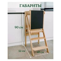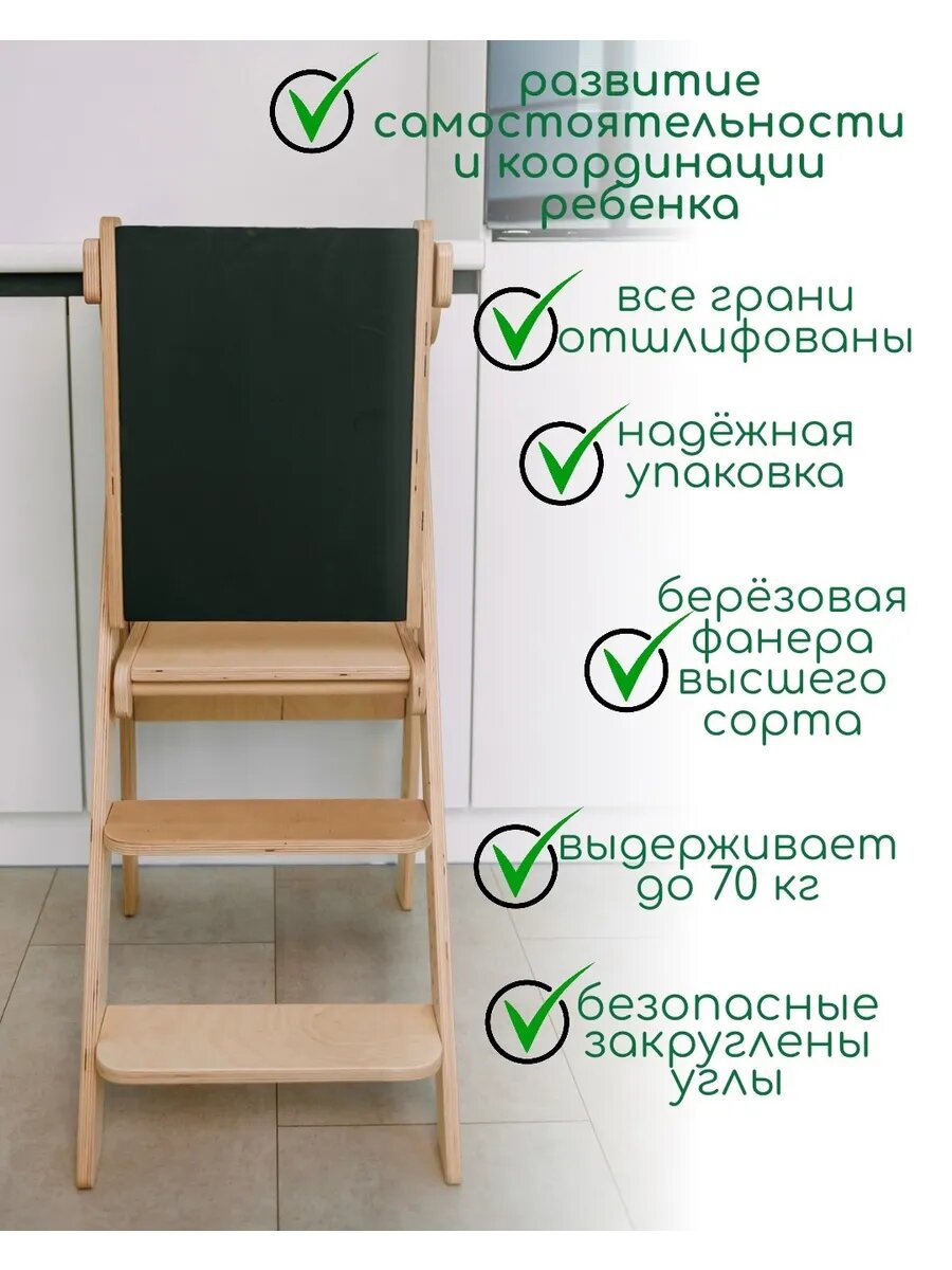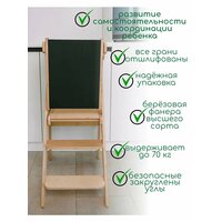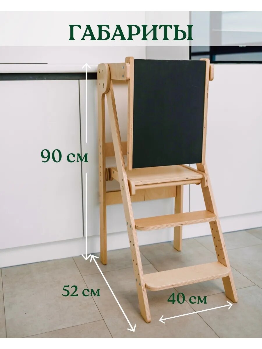 Складная компактная башня помощника Монтессори, для детей, выполнена из натурального дерева высшего сорта. Устойчивая конструкция, которая гладко отшлифована, покрыта маслом. Грифельная доска для рисования ( идет в комплекте ) станет отличным местом для творчества, также прослужит защитой от падения. Башня регулируется по высоте под рост ребенка. Простая удобная сборка, где используется качественная фурнитура. Её можно использовать как стул, а так же стремянку для взрослого человека. Развивает самостоятельность ребенка. Конструкция крепкая, удобная и безопасная, подходит для любого возраста вашего ребенка.