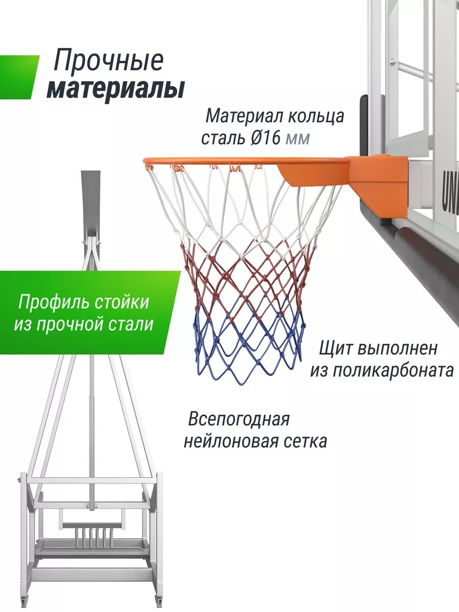 Баскетбольная стойка UNIX Line производится из стали с защитным полимерным покрытием. Собирается как конструктор по частям, которые фиксируются замковым соединением. Сооружение используется как в закрытых помещениях, так и для уличных соревнований. Команда может перевозить свое оборудование на другие площадки - стойки разбираются, складываются и легко переносятся. Мобильную баскетбольную стойку можно использовать в помещении и на улице. Данная система не предназначена для детей младше 3 лет.