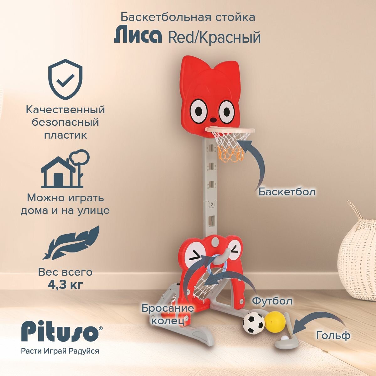 Купить Баскетбольное кольцо детское Pituso Лиса, стойка с кольцебросом и футбольными воротами, красный с доставкой по всей России.