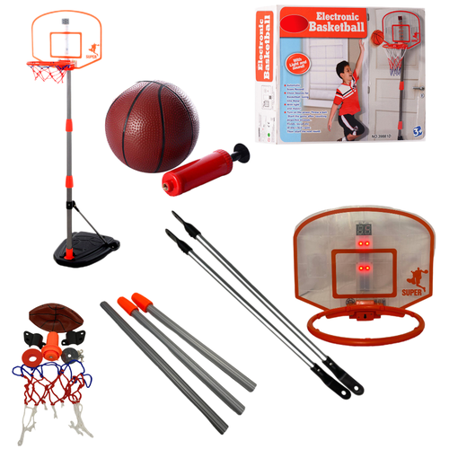 Набор Баскетбол предназначен для игры мальчиков и девочек от 3-х лет. Так же данный набор станет превосходным подарком ребенку на любой праздник. Баскетбол прекрасно развивает координацию, меткость и ловкость. Для интересной игры, организации досуга и тренировок, прекрасным выбором станет Баскетбольная стойка. Она отличается достаточно простой и надежной конструкцией, легко разбирается и собирается, подходит для игры как на открытом воздухе, так и в помещении. В комплекте также есть пластиковый щит, кольцо, сетка, мяч и насос, металлическая стойка. Для лучшей устойчивости заполните основание песком или водой. Игровой набор мобилен, легко собирается и не занимает много места. Электронный ж/к дисплей позволяет устроить настоящее соревнование, отслеживать результаты, настраивать время, музыку , сохранять результаты. Работает от 3-х элементов питания ААА 1,5V( в комплект не входят). Игра сопровождается веселыми мелодиями, звуками, аплодисментами. Благодаря регулируемой подставке вы можете отрегулировать высоту корзины в соответствии с потребностями ребенка. В набор входит: баскетбольный щит с кольцом, подставка, мяч, сетка, насос, элементы для сборки конструкции. Высота стойки 97-170 см, Диаметр кольца 24 см, Размер подставки 40.0х30.0х6.0см, Диаметр мяча 6". Габариты упаковки 49.0х38.0х11.5см. Все предметы, входящие в набор выполнены из высококачественных материалов. Внимание! Уважаемый покупатель, обращаем Ваше внимание, что игла для насоса находится в самой ручке данного насоса.